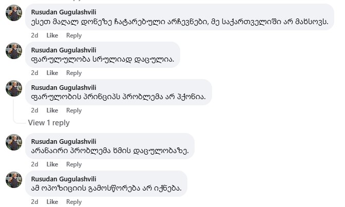 Leri Pantsulaia: Uh, it gave me goosebumps. Such a serious thinker does Gvaramia have?! Don't you know that the elections were conducted on a high level? Why do you need to post such hypocritical comments? Aren't you bored after all?