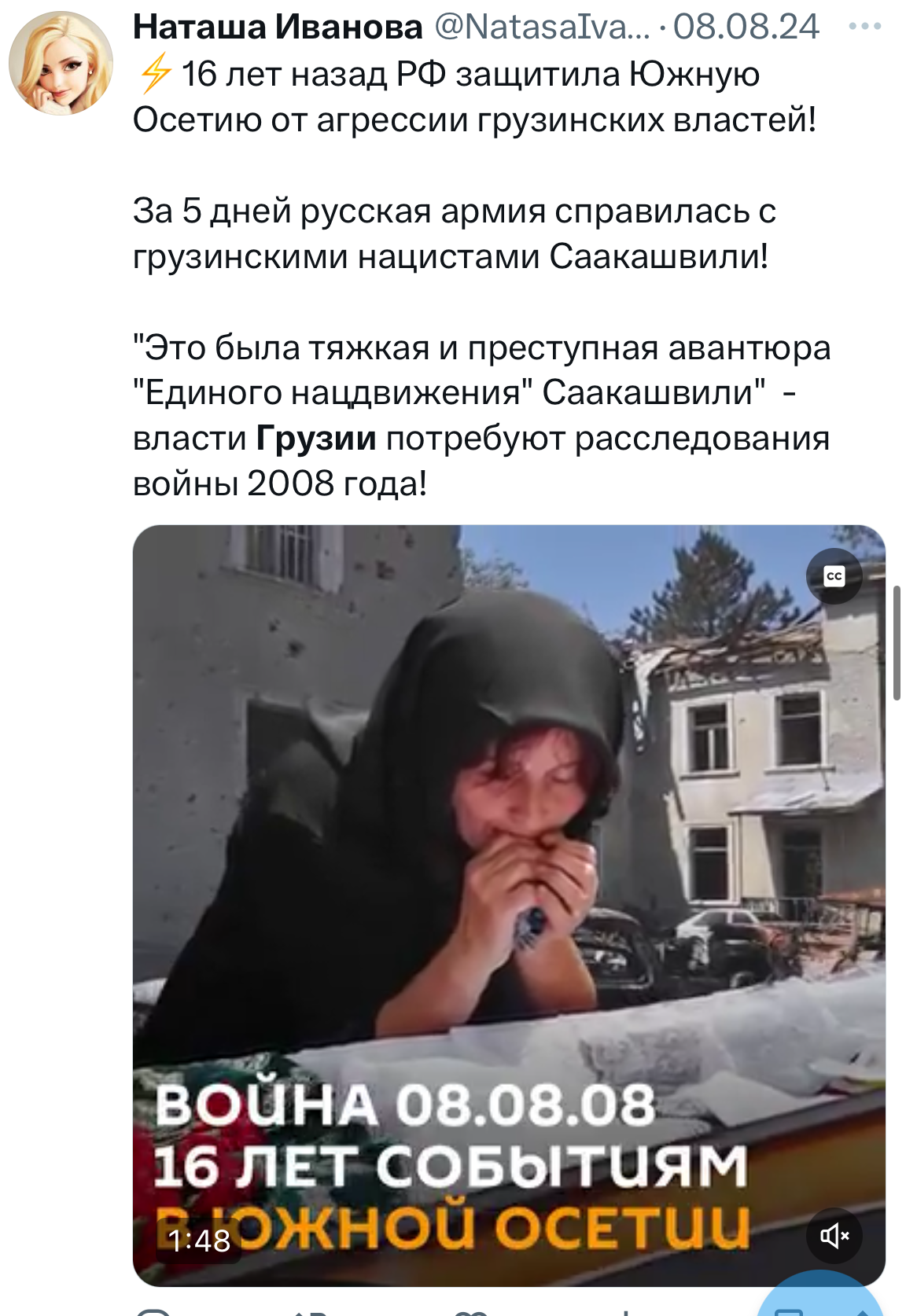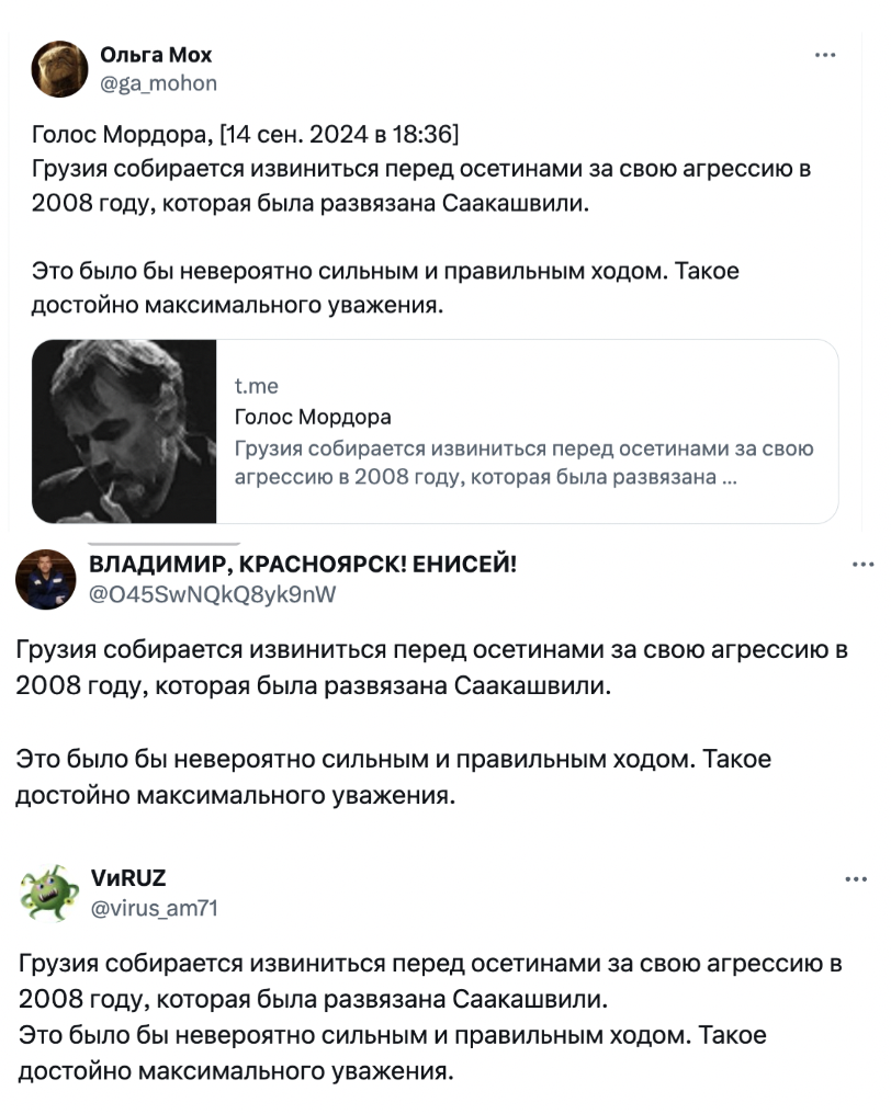 აღსანიშნავია, რომ 2024 წლის 8 აგვისტოს იგივე კრემლისტურ ანგარიშებზე გაზიარებული იყო გზავნილი „რუსეთმა დაიცვა სამხრეთ ოსეთი და გაანადგურა სააკაშვილის ნაცისტები“. მსგავსი პოსტი რუსეთის საგარეო საქმეთა სამინისტროს პროფილზეც გამოქვეყნდა.