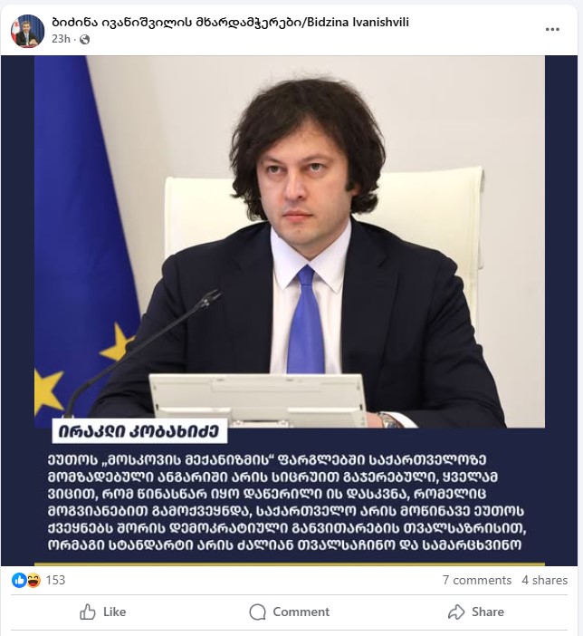 16 მარტს, ირაკლი კობახიძემ ბრიფინგი გამართა, რომელზეც მოსკოვის მექანიზმზე ისაუბრა და გამოქვეყნებულ ანგარიშს კიდევ ერთხელ უწოდა სიცრუეზე დაფუძნებული. მის მიერ გაკეთებულ განცხადებაში ყველა ის ნარატივი იყო თავმოყრილი, რასაც პროპაგანდისტული ეკოსისტემა დოკუმენტის გამოქვეყნებიდან ავრცელებდა.