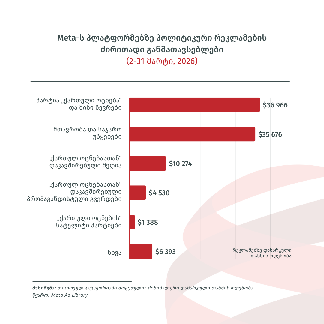 „სამართლიანი არჩევნები“ აგრძელებს Meta-ს პლატფორმებზე პოლიტიკური რეკლამების ყოველთვიურ მიმოხილვას. 2026 წლის 2-31 მარტის პერიოდში ფეისბუქზე, ინსტაგრამზე ან/და მესენჯერში საქართველოს აუდიტორიისთვის 278 გვერდის/ანგარიშის მიერ პოლიტიკური ან სოციალური შინაარსის მქონედ მონიშნული 2,975 რეკლამა განთავსდა, რომელთა ჯამურმა ღირებულებამ 97,184 აშშ დოლარი შეადგინა. Meta-ს რეკლამების ბიბლიოთეკაში მოცემული სარეკლამო დანახარჯების დაახლოებით 39% პარტია „ქართული ოცნებისა“ და მისი წევრების გვერდებზე განთავსებული რეკლამების ხარჯებზე მოდიოდა, 37% - სამთავრობო და საჯარო უწყებების გვერდების, 11% - „ქართულ ოცნებასთან“ დაკავშირებული მედიასაშუალებების, 6% კი ამავე პარტიასთან დაკავშირებული პოლიტიკური გაერთიანებებისა და პროპაგანდისტული გვერდების სარეკლამო ხარჯებზე. ყველა სხვა გვერდზე განთავსებული პოლიტიკური რეკლამების ჯამურმა ღირებულებამ მთლიანი სარეკლამო დანახარჯების მხოლოდ 7% შეადგინა.