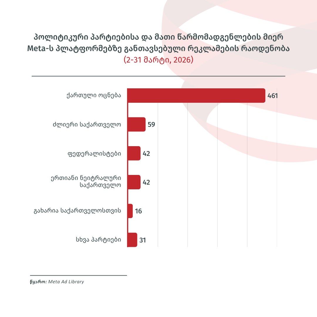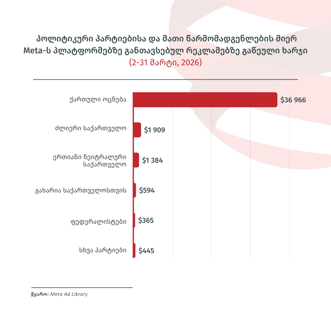 პოლიტიკურ პარტიებს შორის კვლავ მკვეთრი დომინირებით ხასიათდებოდა „ქართული ოცნების“ სარეკლამო კამპანია. ამ პარტიისა და მისი წარმომადგენელი პოლიტიკოსების გვერდებზე 2-31 მარტის პერიოდში 37 ათასამდე აშშ დოლარის ღირებულების 461 რეკლამა გამოქვეყნდა. „ქართული ოცნების“ სარეკლამო დანახარჯების ოდენობამ გასულ თვეში პარტიების მიერ Meta-ს რეკლამებში გადახდილი ჯამური თანხის დაახლოებით 89% შეადგინა.