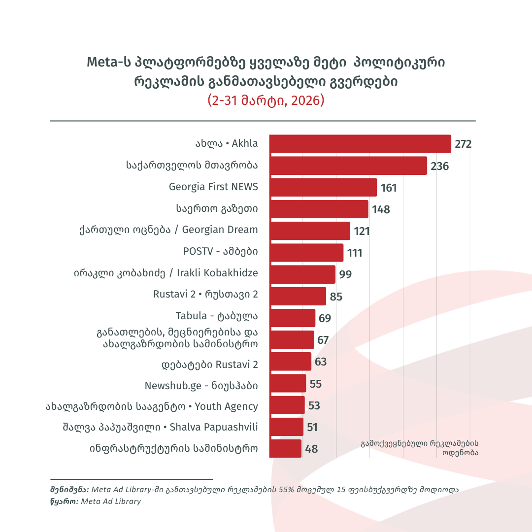 Meta-ს რეკლამების ბიბლიოთეკაში განთავსებული რეკლამების 55% ქვემოთ მოცემულ 15 ფეისბუქგვერდზე მოდიოდა. მათ შორის ყველაზე აქტიური „ქართულ ოცნებასთან“ დაკავშირებული პროპაგანდისტული გვერდი „ახლა • Akhla“ იყო. მონიტორინგის პერიოდში გამოქვეყნებული პოლიტიკური რეკლამების რაოდენობით მას მოჰყვებოდნენ საქართველოს მთავრობის ოფიციალური ფეისბუქგვერდი, „ქართული ოცნების“ მხარდამჭერი, ანტიდასავლური ნარატივების გამავრცელებელი გვერდი - „Georgia First NEWS“, „ქართულ ოცნებასთან“ დაკავშირებული მედიის გვერდი - „საერთო გაზეთი“, ასევე “ქართული ოცნების“ ოფიციალური“ ფეისბუქგვერდი და სხვ. აღსანიშნავია, რომ გასულ თვეში მაღალი აქტივობით გამოირჩეოდა დიდი ბრიტანეთის მიერ სანქცირებული „პოს ტვ“-ის ახლადშექმნილი ფეისბუქგვერდიც - „POSTV - ამბები“, რომელიც ამჟამად პლატფორმაზე აღარ იძებნება.