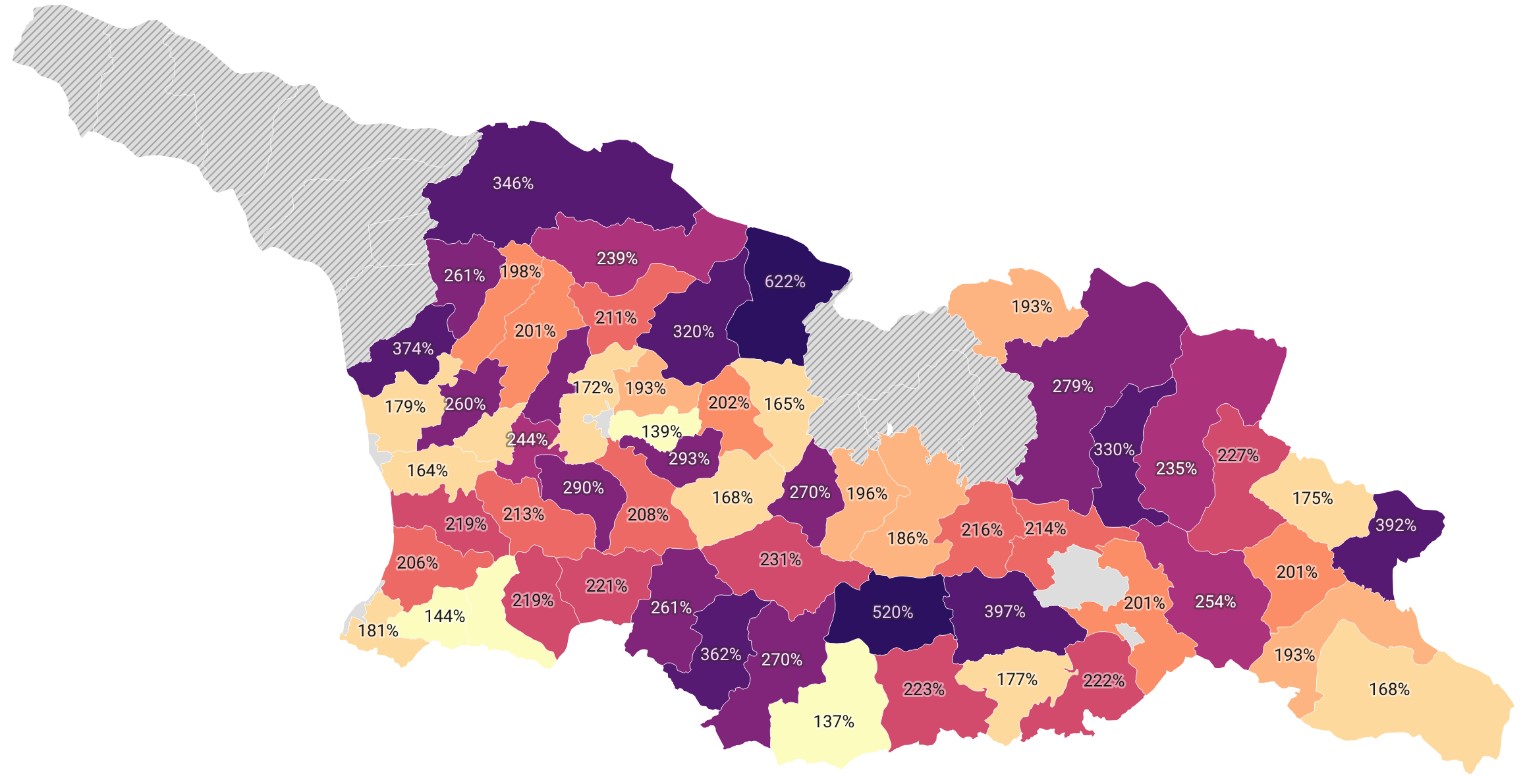 სურათი 1. მუნიციპალიტეტების ერთმანდატიან ოლქებში ამომრჩეველთა რაოდენობის საშუალო რაოდენობიდან გადახრის საერთო დიაპაზონი
