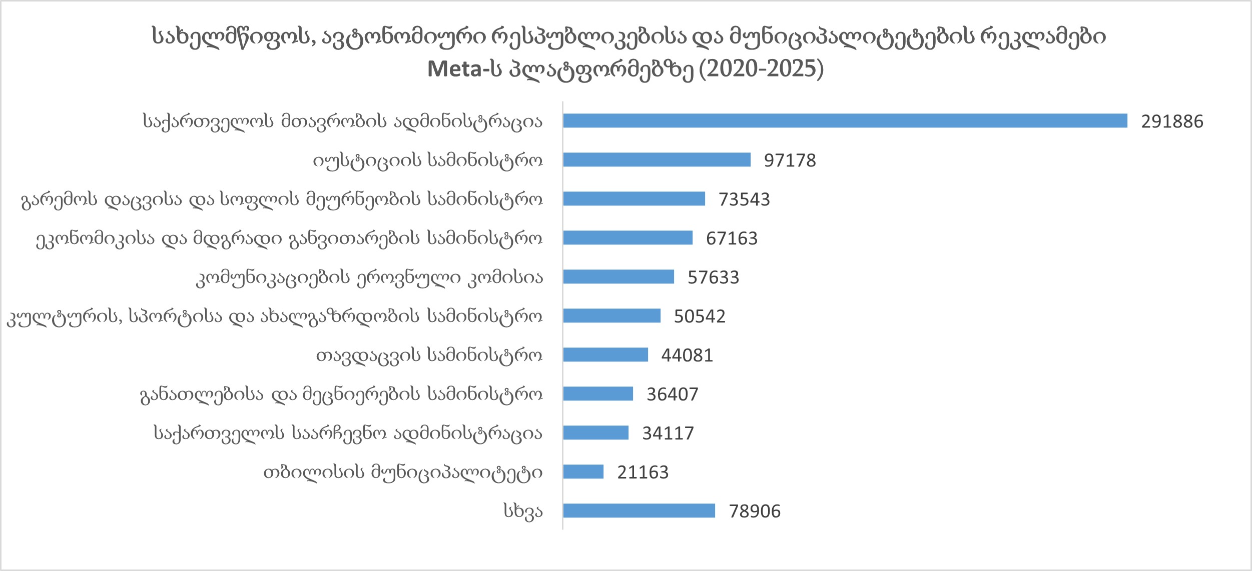 Meta-ს პლატფორმებზე ცენტრალური მთავრობის, საჯარო უწყებების, ავტონომიური რესპუბლიკებისა და მუნიციპალიტეტების გვერდებზე 2020 წლის 4 აგვისტოდან 2025 წლის 4 აგვისტომდე პერიოდში სულ მცირე 852,619 აშშ დოლარის 17,266 რეკლამა განთავსდა. მათ შორის ყველაზე აქტიურად პოლიტიკური რეკლამები მთავრობის ადმინისტრაციის გვერდებზე გამოქვეყნდა. აღნიშნულ გვერდებზე განთავსებული 3,710 რეკლამის ჯამურმა ღირებულებამ 292 ათასამდე აშშ დოლარი შეადგინა. გამოქვეყნებული რეკლამების რაოდენობითა და სარეკლამო დანახარჯებით ასევე გამოირჩეოდნენ სხვადასხვა სამინისტროს სისტემის, საარჩევნო ადმინისტრაციისა და თბილისის მუნიციპალიტეტის კუთვნილი ოფიციალური გვერდები.