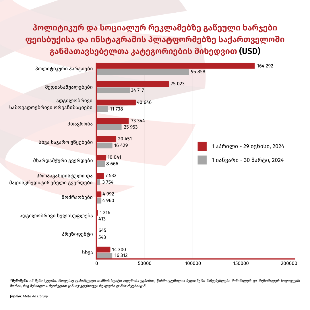 2024 წლის პირველ კვარტალთან შედარებით, აპრილი-ივნისის პერიოდში სარეკლამო დანახარჯების ზრდა გამოვლინდა გვერდების ყველა კატეგორიაში. მათ შორის, 71%-ით გაიზარდა პოლიტიკური პარტიებისა და მათი წარმომადგენლების გვერდების კატეგორიაში ფეისბუქისა და ინსტაგრამის რეკლამებისთვის დახარჯული თანხის სიდიდე. ამასთან, აღნიშნული ზრდა მნიშვნელოვანწილად გამოწვეული იყო მმართველი პარტიის წარმომადგენელთა რეკორდულად მაღალი დანახარჯით. ამავდროულად, საერთო ჯამში, გაორმაგდა მედიასაშუალებების მიერ „მეტას“ რეკლამებისთვის გადახდილი თანხის სიდიდე, რაც, ძირითადად, პროსახელისუფლებო მედიის რამდენიმეჯერ გაზრდილი ხარჯებით იყო განპირობებული. გაორმაგდა პროპაგანდისტული და ოპოზიციის მადისკრედიტირებელი გვერდების სარეკლამო დანახარჯები. წინა კვარტალთან შედარებით, 3.5-ჯერ გაიზარდა საზოგადოებრივი ორგანიზაციების მიერ „მეტას“ რეკლამებში დახარჯული თანხის საერთო ოდენობაც.