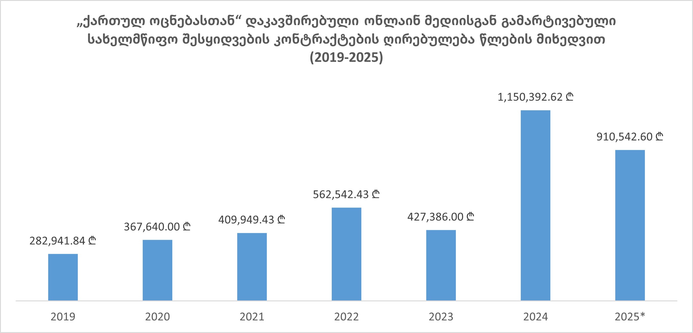 - „ქართულ ოცნებასთან“ დაკავშირებული ონლაინ მედია სააგენტოები საბიუჯეტო შემოსავლებს ძირითადად გამარტივებული შესყიდვების გზით იღებდნენ. 2019-2025 წლებში ამ ტიპის კონტრაქტების საერთო რაოდენობამ 1,159 შეადგინა, ხოლო მათი ჯამური ღირებულება 4.3 მილიონამდე ლარს გაუტოლდა.