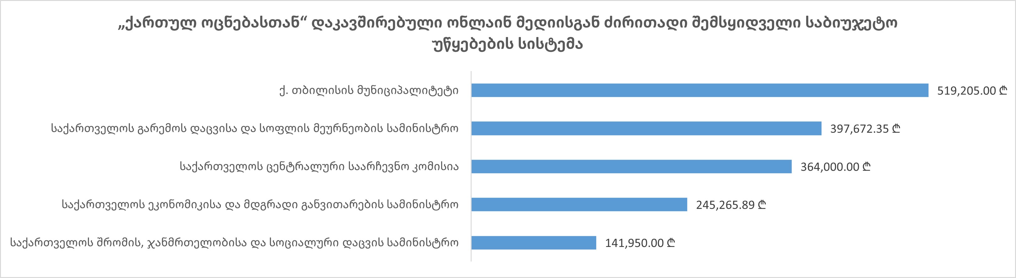 - „ქართულ ოცნებასთან“ დაკავშირებული ონლაინ მედიის კომპანიების მიერ საბიუჯეტო უწყებებთან გაფორმებული გამარტივებული შესყიდვების კონტრაქტების მიხედვით, დაფინანსების ძირითად წყაროს ადგილობრივი თვითმმართველი ერთეულებისა (46%) და სახელმწიფო ბიუჯეტები (33%) წარმოადგენდა. დაფინანსების 4% მიღებული იქნა აჭარისა და აფხაზეთის ავტონომიური რესპუბლიკების მთავრობებისგან, ხოლო 17% დაფინანსებული იქნა საჯარო უწყებების საკუთარი შემოსავლების მეშვეობით;