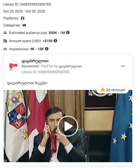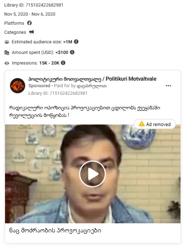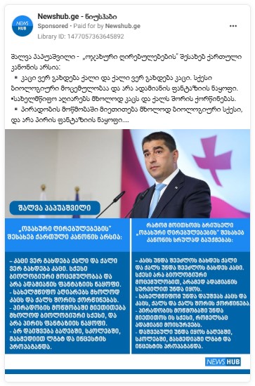 - დაფინანსებული მედიასაშუალებების სარედაქციო პოლიტიკა თანხვედრაშია მმართველი პარტიის ნარატივებთან. ისინი ტირაჟირებენ „ქართული ოცნების“ გზავნილებს, ამზადებენ ან ავრცელებენ პროპაგანდისტულ კონტენტს, ხოლო ზოგ შემთხვევაში ორგანიზებულად მონაწილეობენ ოპოზიციის წინააღმდეგ მიმართულ კამპანიებში. ძირითადად „ქართული ოცნებისთვის“ ხელსაყრელი ნარატივების გასავრცელებლად ნიუსჰაბის (2020 წლის 25 ნოემბრამდე - „Pia.ge - ახალი ამბები“) ფეისბუქგვერდზე 2020-2025 წლებში 25.4 ათას აშშ დოლარზე მეტი ღირებულების 1,721 პოლიტიკური რეკლამაც განთავსდა;