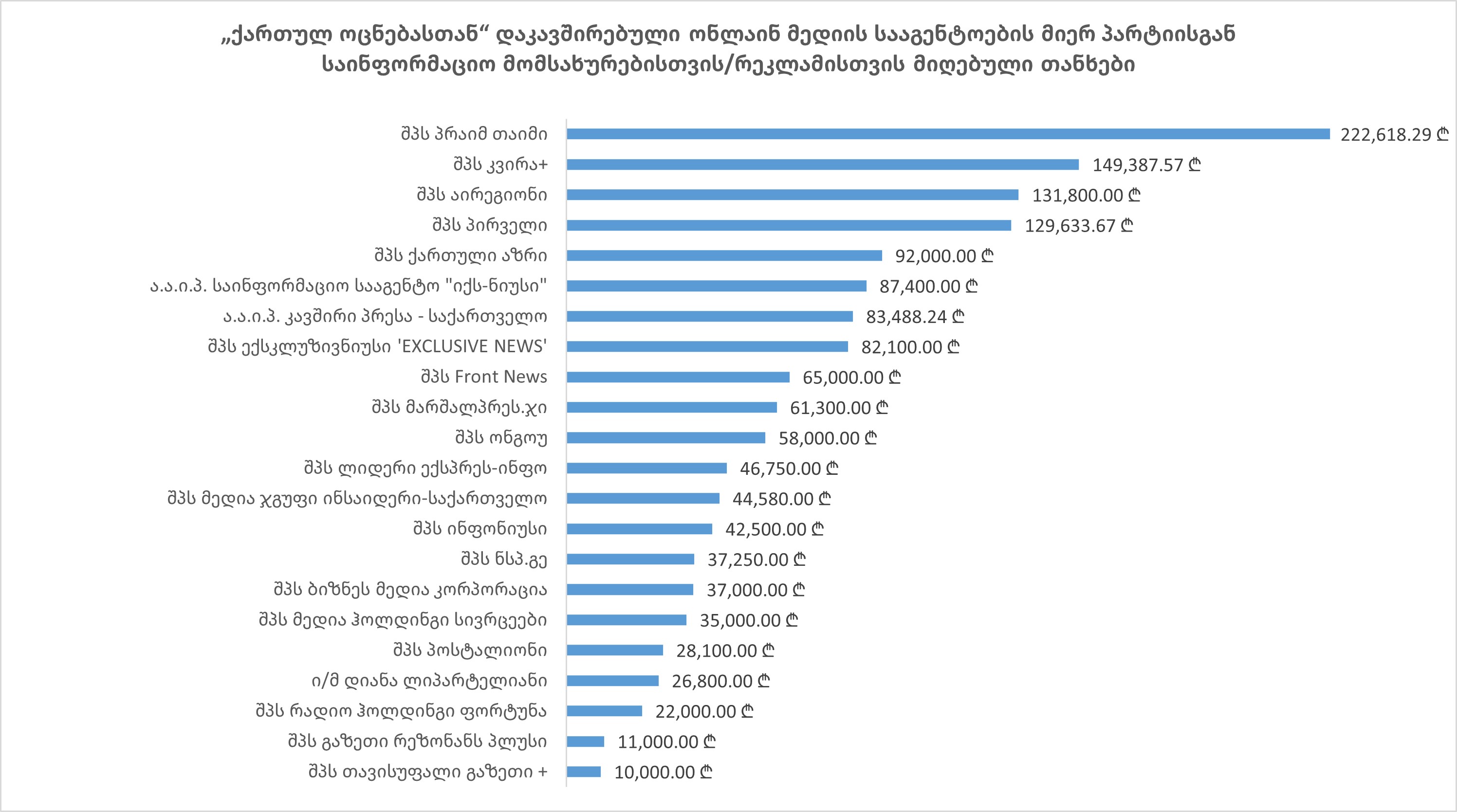 - ანტიკორუფციულ ბიუროსა და სახელმწიფო აუდიტის სამსახურში წარდგენილი ფინანსური დეკლარაციების მიხედვით, 2019-2025 წლებში „ქართულმა ოცნებამ“ ონლაინ მედიის 22 კომპანიას/ორგანიზაციას ჯამში 1,503,708 ლარი გადაუხადა. ბოლო ორი წლის განმავლობაში გადახდები ხორციელდებოდა თითქმის ყოველთვიურად, როგორც საარჩევნო, ისე არასაარჩევნო პერიოდში, რაც იმაზე მიუთითებს, რომ პარტიასა და ამ სააგენტოებს შორის გრძელვადიანი და სტაბილური თანამშრომლობა ჩამოყალიბდა;