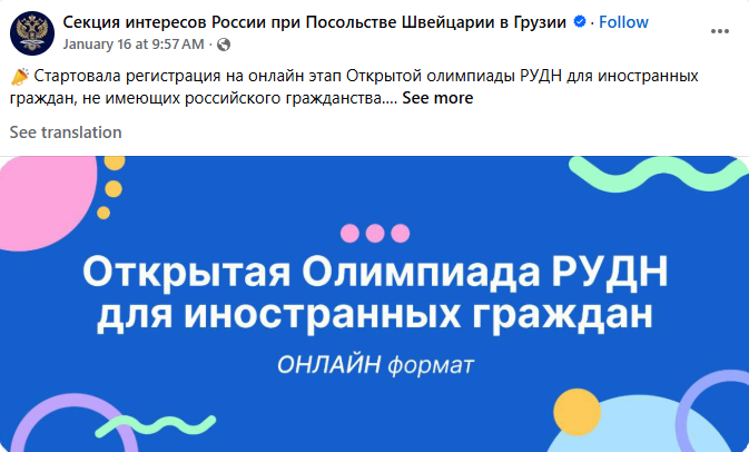 ანონიმურად მოქმედ ცრუ მედიის გვერდებსა და ანგარიშებზე დაკვირვების შედეგად იკვეთება, რომ ისინი, სავარაუდოდ, დაკავშირებულია შვეიცარიის საელჩოში რუსეთის ინტერესების სექციასთან. ამას მოწმობს ერთი და იგივე საკითხისადმი მიძღვნილი კონტენტი, რომელიც თბილისში შვეიცარიის საელჩოში რუსეთის ინტერესების სექციის მიერ ოფიციალურ ფეისბუქგვერდზე გამოქვეყნებიდან მოკლე ხანში ანონიმურ გვერდებსა და ანგარიშებზეც ჩნდება. მაგალითად, იმავე დღეს, როდესაც რუსეთის ინტერესების სექციის ფეისბუქგვედზე რუდნის ოლიმპიადაზე რეგისტრაციის დაწყების შესახებ საინფორმაციო ქარდი გამოქვეყნდა, იდენტურ თემასთან დაკავშირებული ვიდეომასალა განთავსდა ცრუ მედიის გვერდებსა და ანგარიშებზეც.