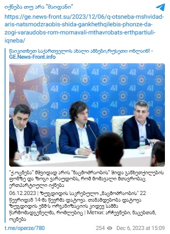 "News-Front" also directed discrediting messages towards opposition political parties, accusing them of seeking to initiate a second war front in Georgia.[2] The outlet disseminated a video collage featuring statements from opposition political figures under the title "Who Wants War in Georgia." Additionally, the opposition was accused of prioritizing the interests of the West and America over those of the nation.