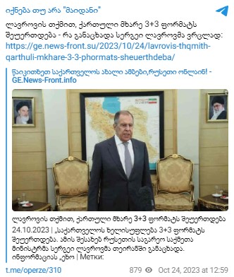 News Front also published statements from Russian high-ranking officials. For instance, a statement from the Minister of Foreign Affairs of Russia, Sergey Lavrov, was disseminated, insinuating that Georgia was joining the 3+3 format, although the Georgian side did not confirm this. Additionally, the statement of the de facto leader of Abkhazia, Aslan Bzhania, asserting that Armenia and Georgia are under Western influence while Abkhazia remains independent, was shared. Furthermore, a letter from Valery Kvaratskhelia, the head of the "Georgia-Russia Friendship Center," was also published. In the letter, it was suggested that Prime Minister Gharibashvili had two options: either follow the path of King Erekle and foster closer ties with Russia, or follow Pashinyan's path and pursue the "Ukrainization" of Georgia.