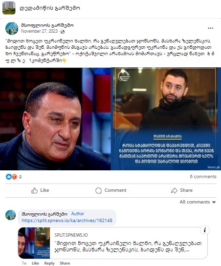 Starting from the end of June 2023, both "Spacenews" and Ntv.com.ge adopted new tactics within Facebook groups. Instead of directly sharing links to their content, they began posting photos in groups with a prompt to visit the link provided in the first comment. The actual website links are then shared within the comments section. Notably, this method is also utilized to disseminate links to "News-Front" materials from the Telegram channel on Facebook.