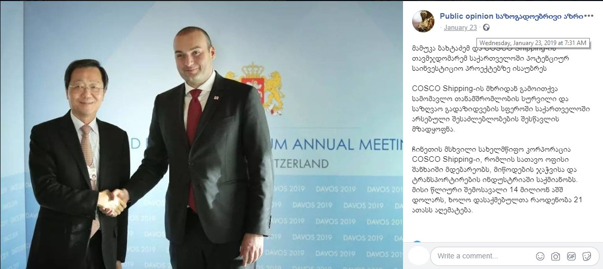 ''Mamuka Bakhtadze and COSCO Shipping corporation chairman talked about potential investment projects in Georgia. COSCO shipping expressed their desire for future cooperation and readiness to study opportunities that exist in Georgia in the field of maritime shipping. Largest state corporation of China, COSCO Shipping with its head office located in Shanghai, operates in the industry of supply chain and transportation. Its annual revenue is USD 14 million and it employees more than 21 thousand people.''
