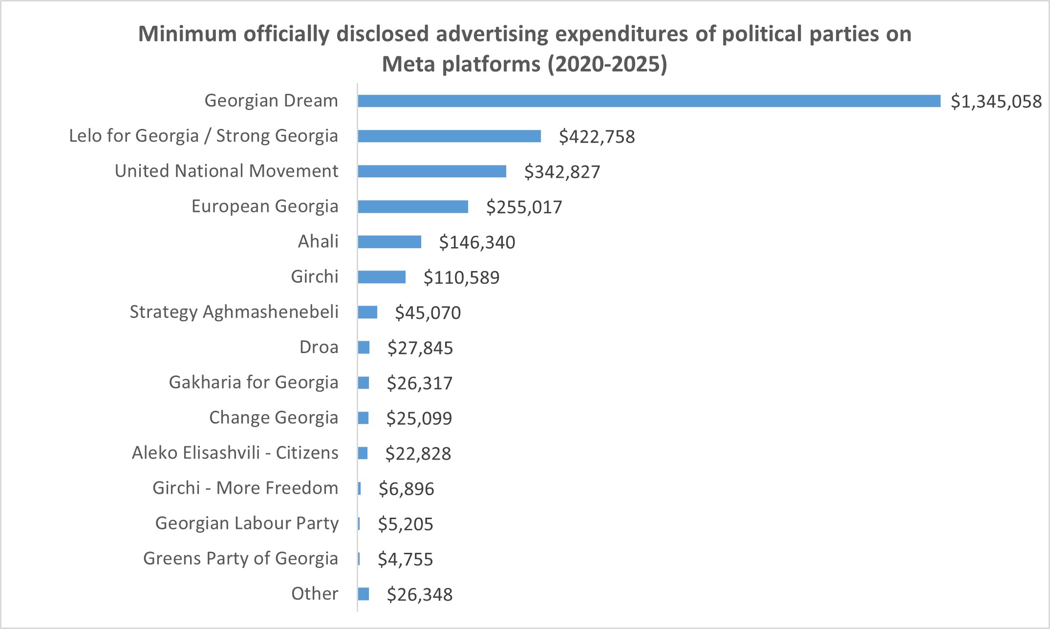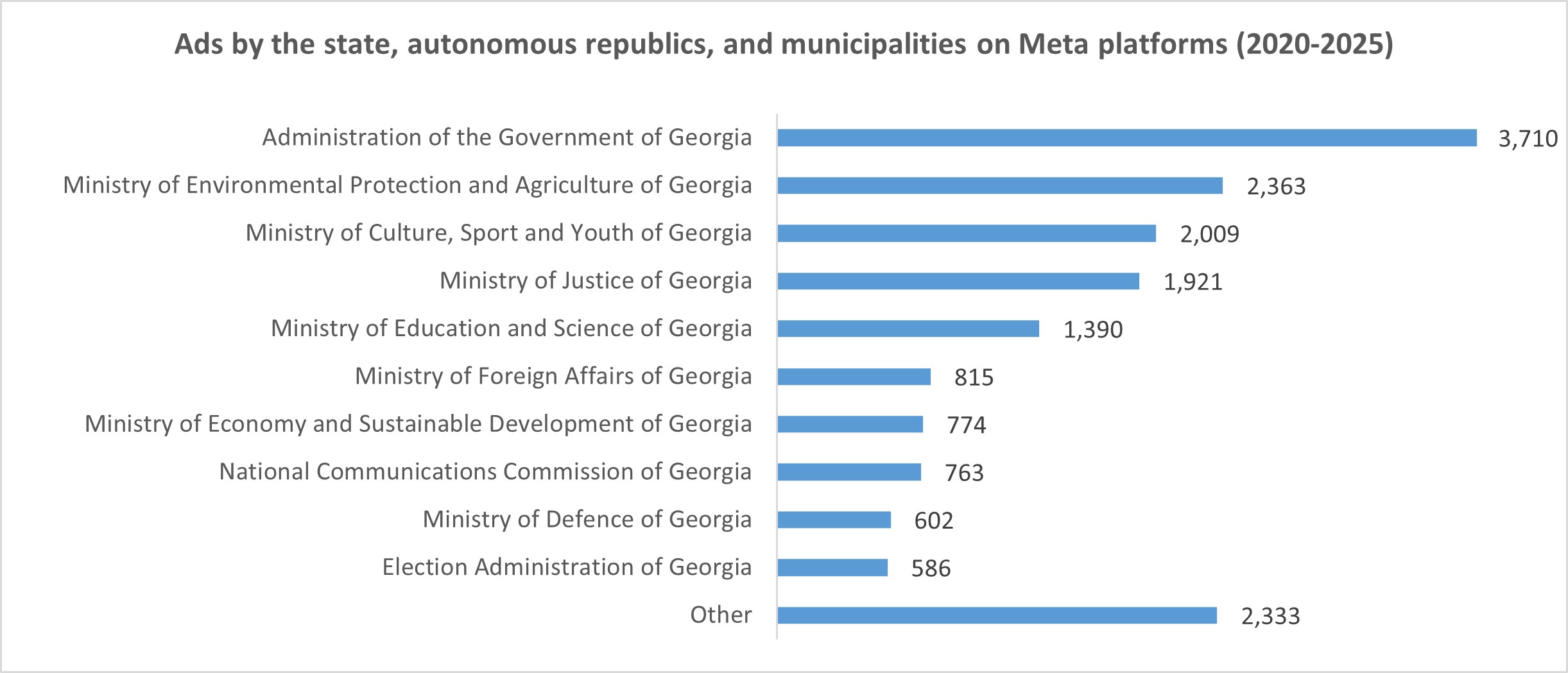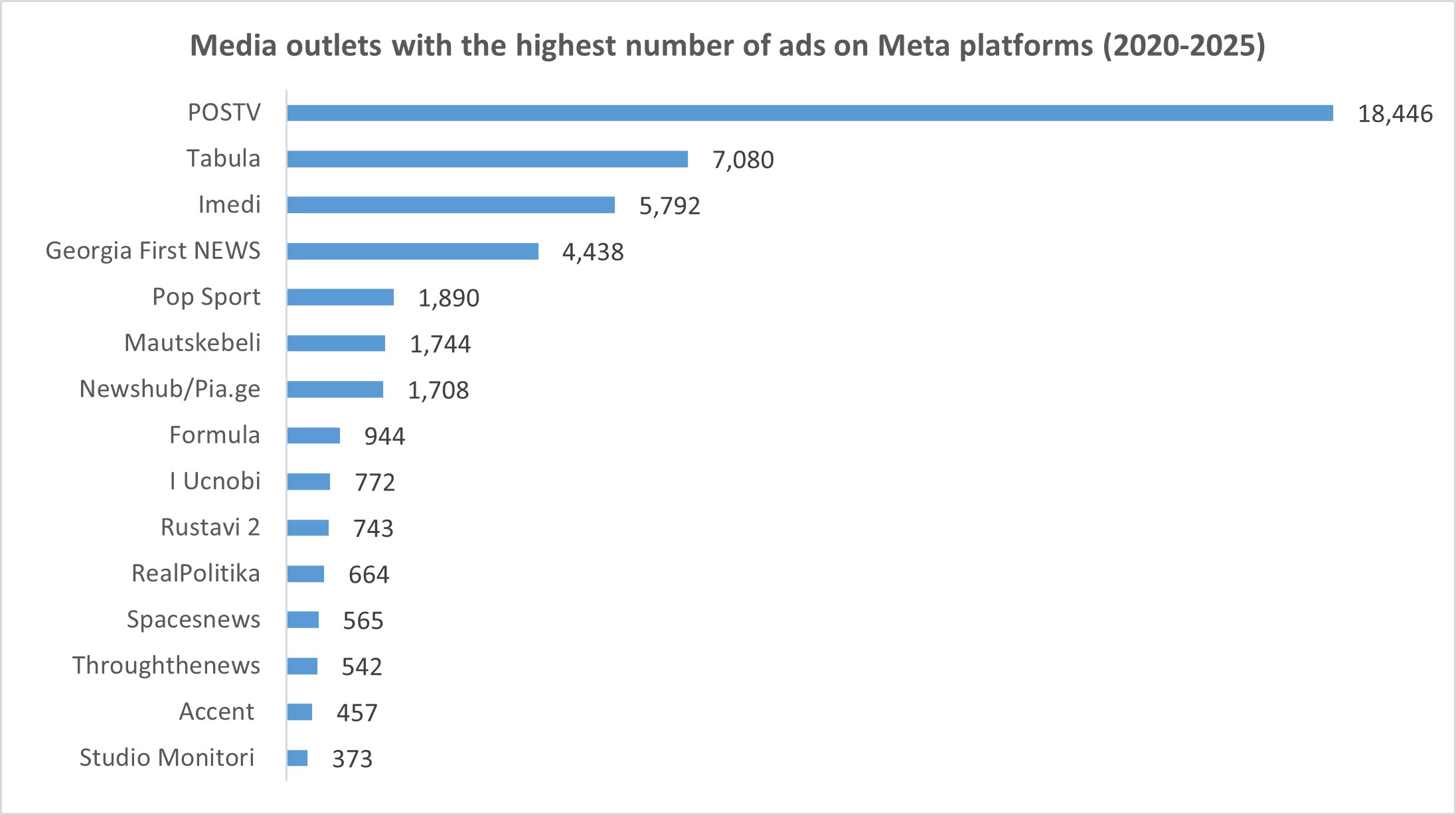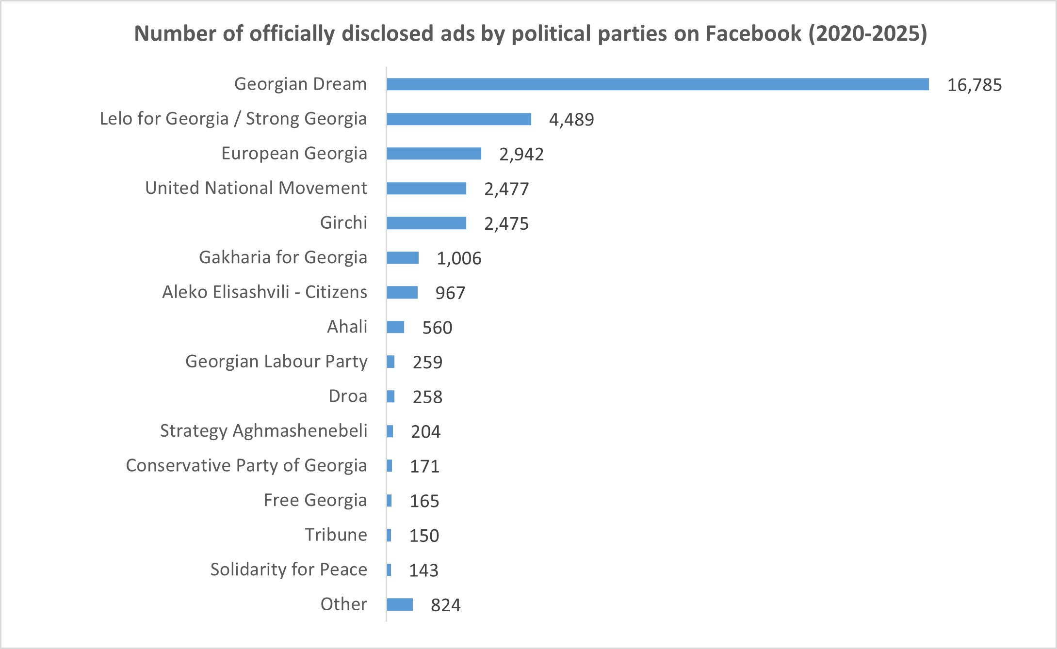- In August 2020, Facebook (now Meta) launched the Ad Library in Georgia, providing data on political, electoral, and social advertisements. Between 2020–2025, a total of 172,577 ads targeting Georgian audiences were published across Meta’s platforms, with a combined value of up to $6.8 million USD. By average annual volume of ads, Georgia ranked 40th among 204 countries and territories, ahead of all countries with populations similar in size to Georgia’s. The most active advertisers were political parties, media outlets, and government institutions.