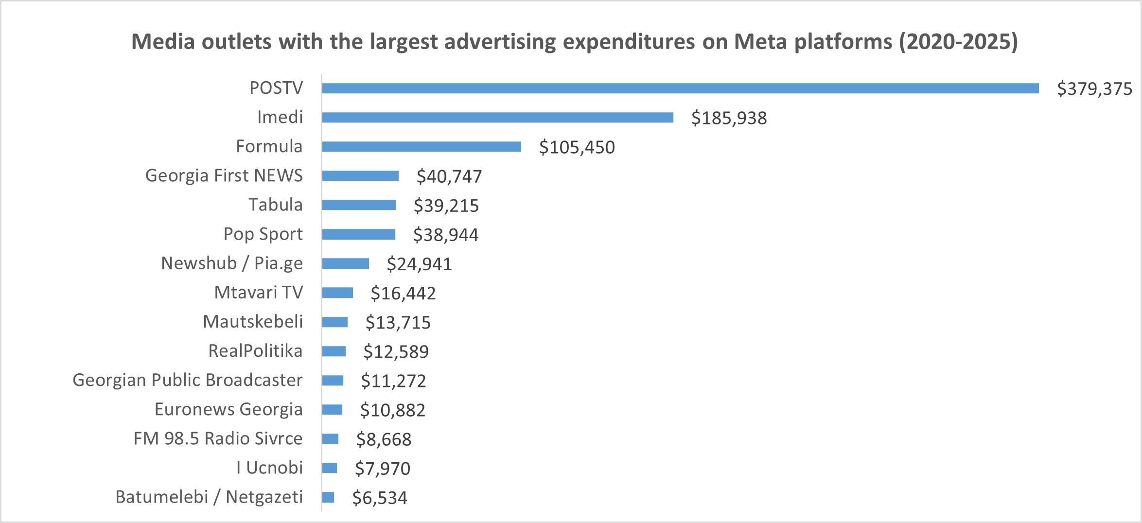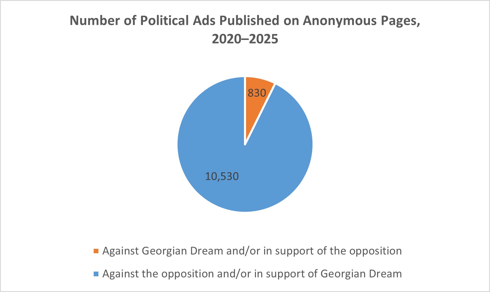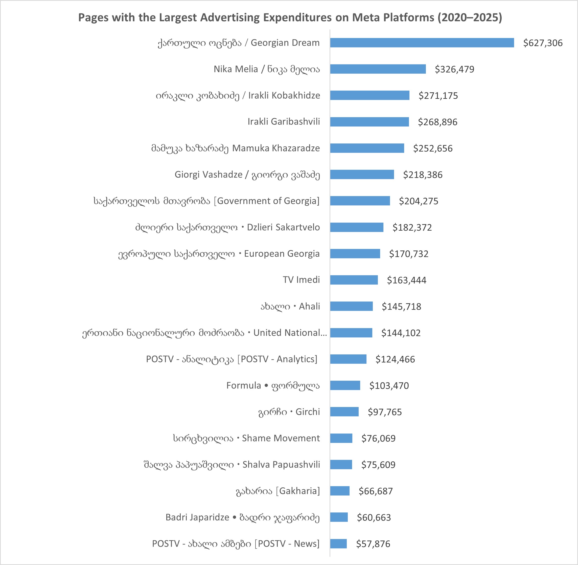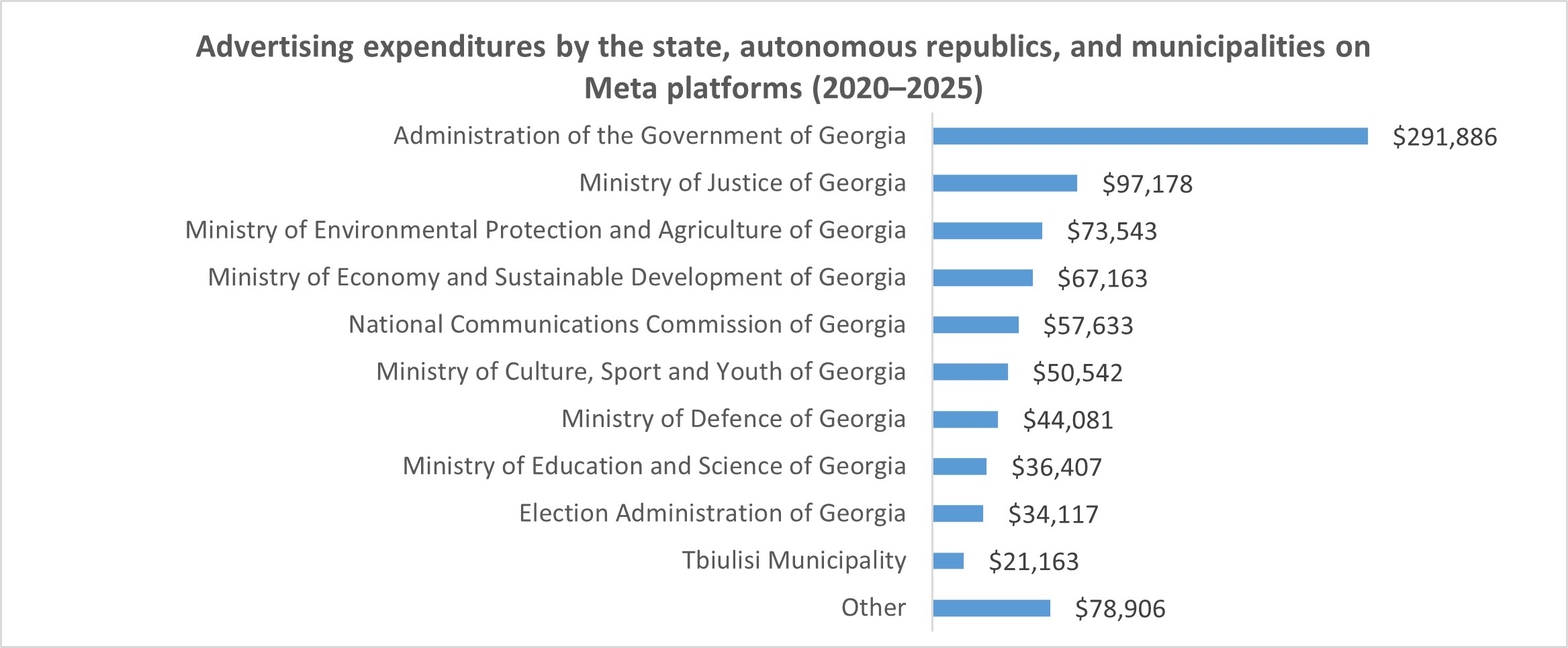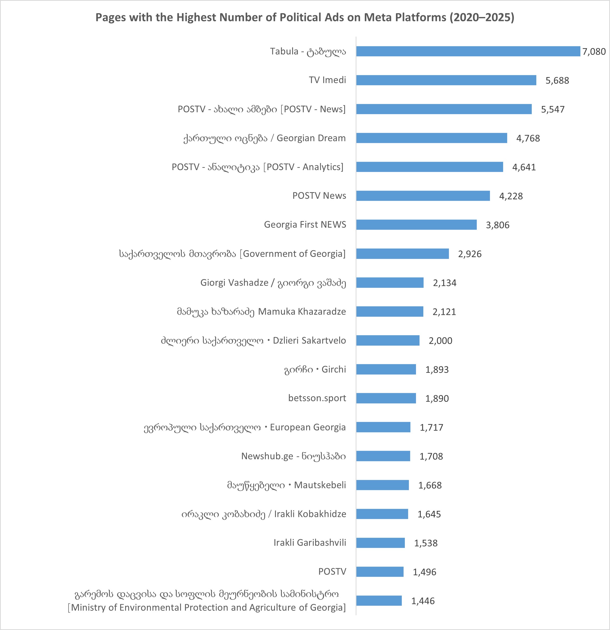 - In August 2020, Facebook (now Meta) launched the Ad Library in Georgia, providing data on political, electoral, and social advertisements. Between 2020–2025, a total of 172,577 ads targeting Georgian audiences were published across Meta’s platforms, with a combined value of up to $6.8 million USD. By average annual volume of ads, Georgia ranked 40th among 204 countries and territories, ahead of all countries with populations similar in size to Georgia’s. The most active advertisers were political parties, media outlets, and government institutions.