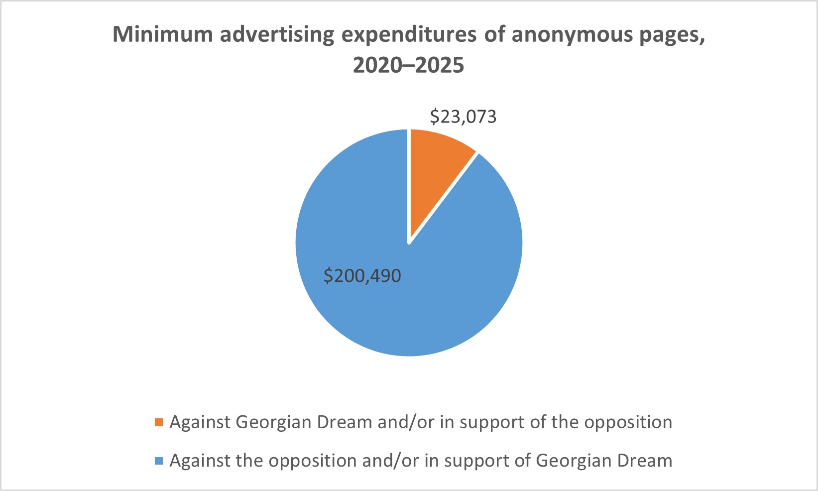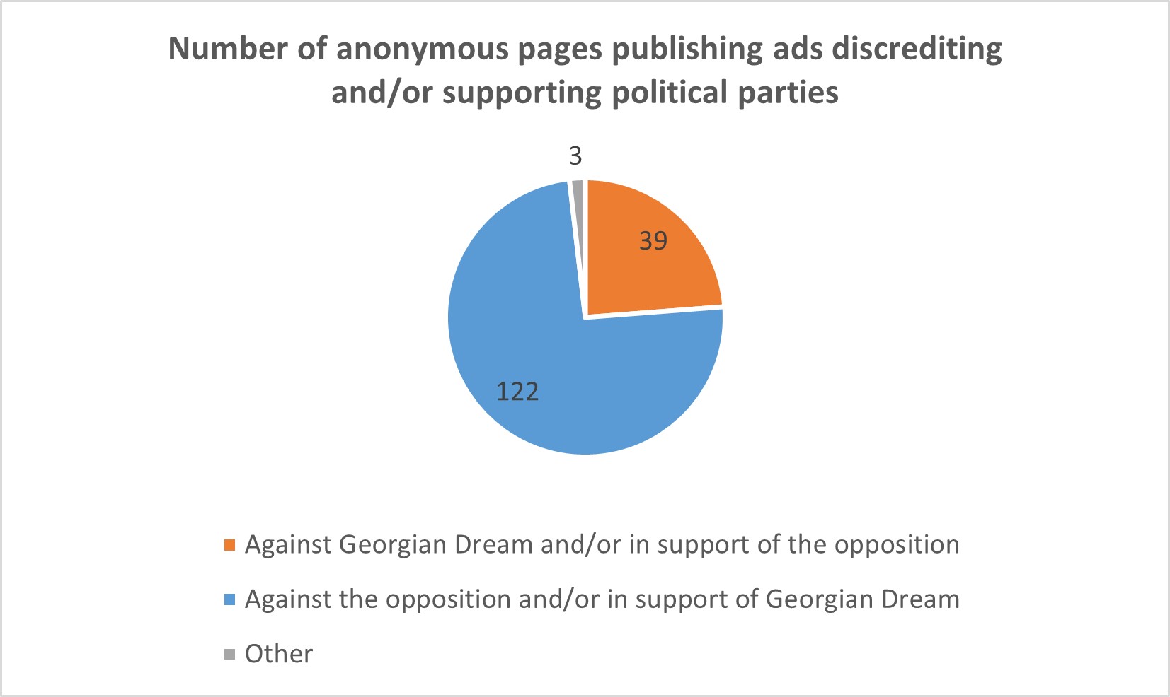 Over the past five years, at least 164 anonymous pages published 11,378 ads supporting or discrediting political parties, worth a total of at least $223,860 USD. 93% of these ads were directed against the opposition and in favor of Georgian Dream. Spending on such ads accounted for about 90% of all anonymous ad spending.
