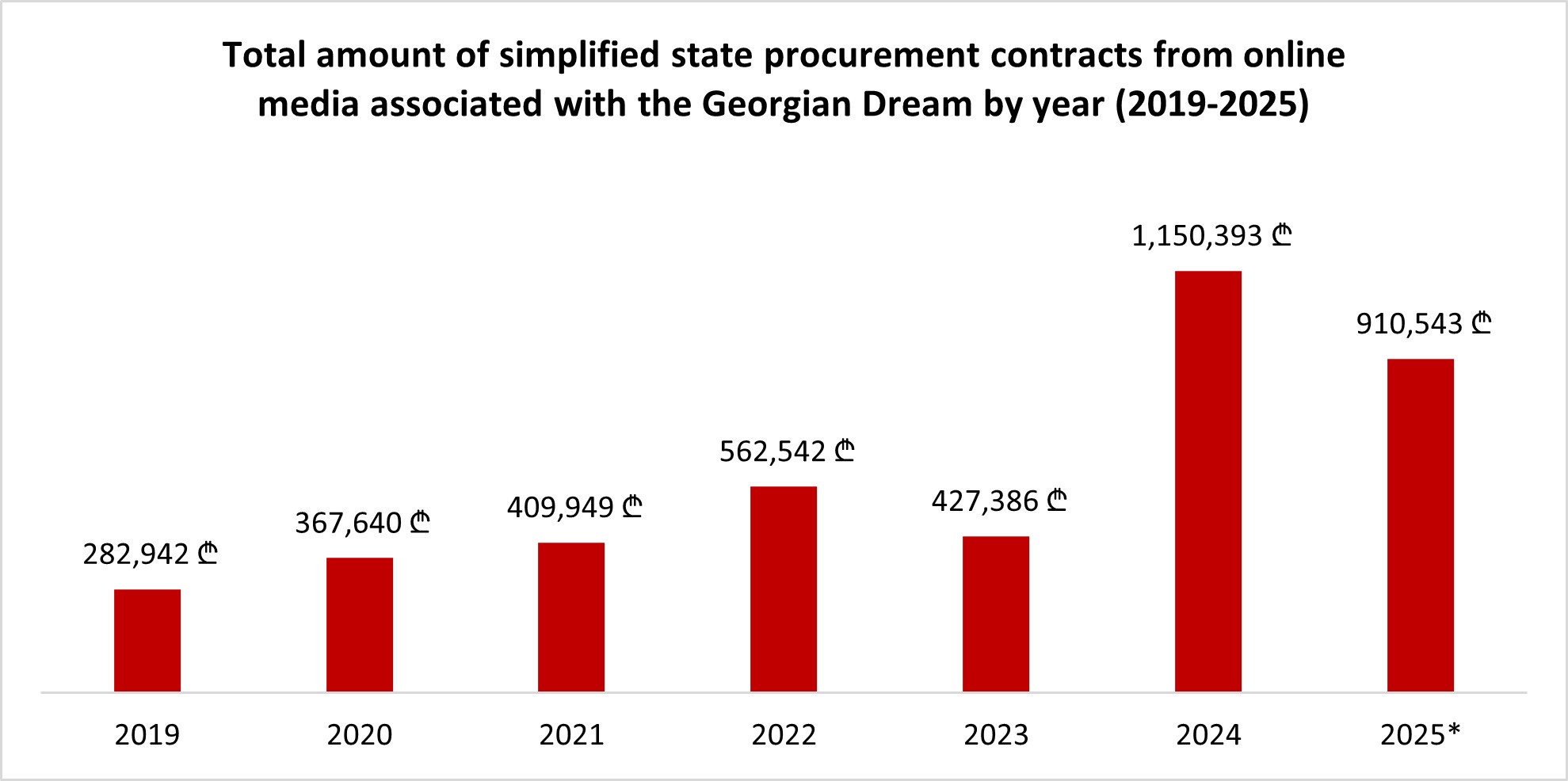 - Online media outlets linked to Georgian Dream also receive state budget revenues, primarily through simplified public procurement. Between 2019 and 2025, these contracts amounted to 1,159 in total, with a cumulative value approaching 4.3 million GEL.