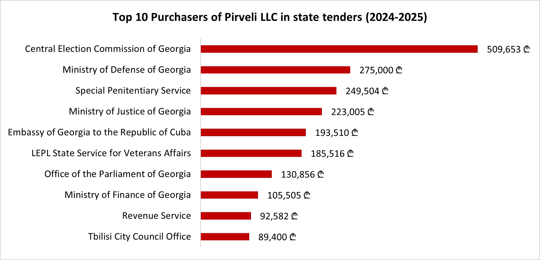 According to data from the State Procurement Agency, as of 18 September 2025, during the years 2024-2025, the company won 32 tenders with a total value of 2,617,744 GEL. Remarkably, the company’s tender success rate reached 100%. The majority of these contracts concerned information support services, which state institutions systematically procured. Among the largest purchasers through these tenders was the Central Election Commission of Georgia, followed by various ministries and subordinate agencies. The ten largest purchasers also included the Embassy of Georgia in the Republic of Cuba, the Administration of the Parliament of Georgia, and the Administration of the Tbilisi City Council.
