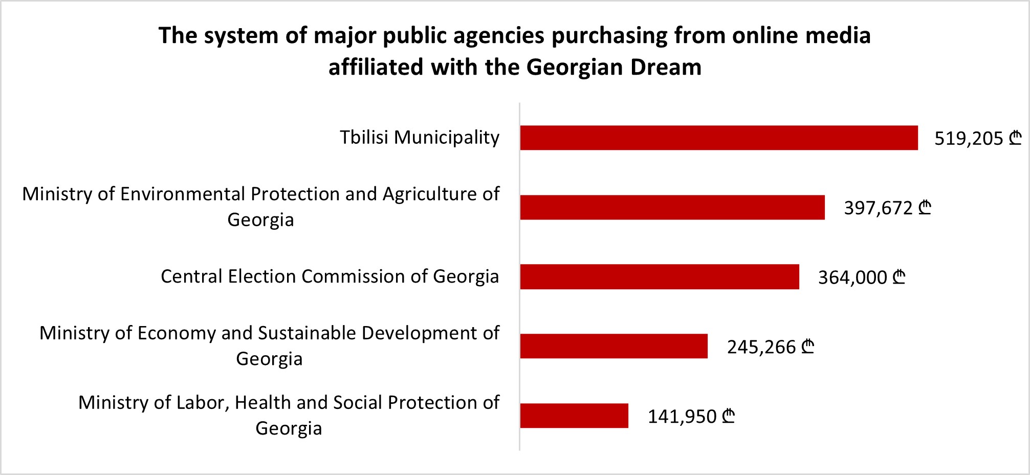 In addition to central government and local self-government bodies, the governments of the autonomous republics also served as funding sources for online media associated with Georgian Dream. Among them, the agencies of the Government of the Autonomous Republic of Adjara carried out simplified procurements worth 141,267 GEL, while the Government of the Autonomous Republic of Abkhazia conducted procurements totaling 80,781 GEL.