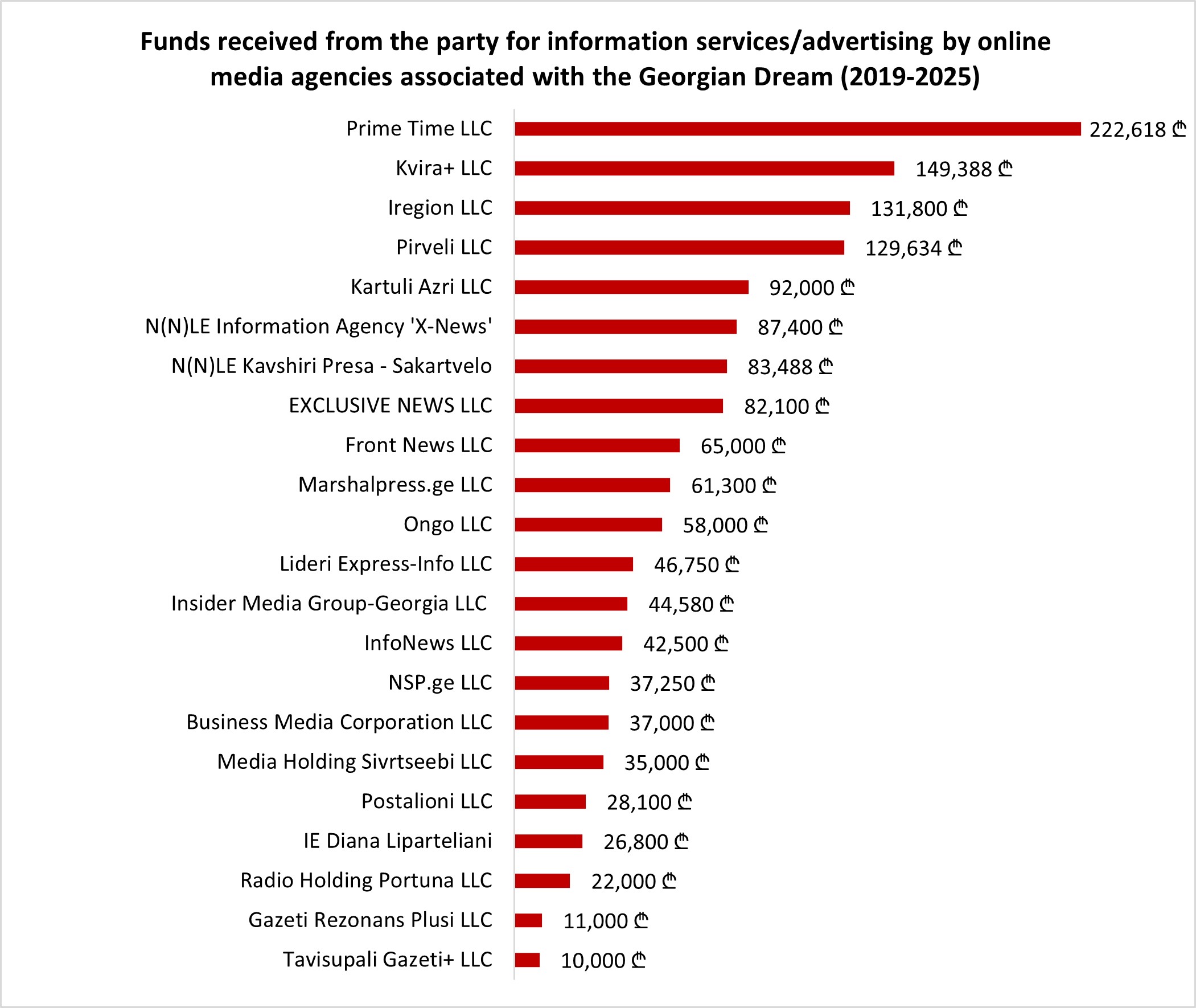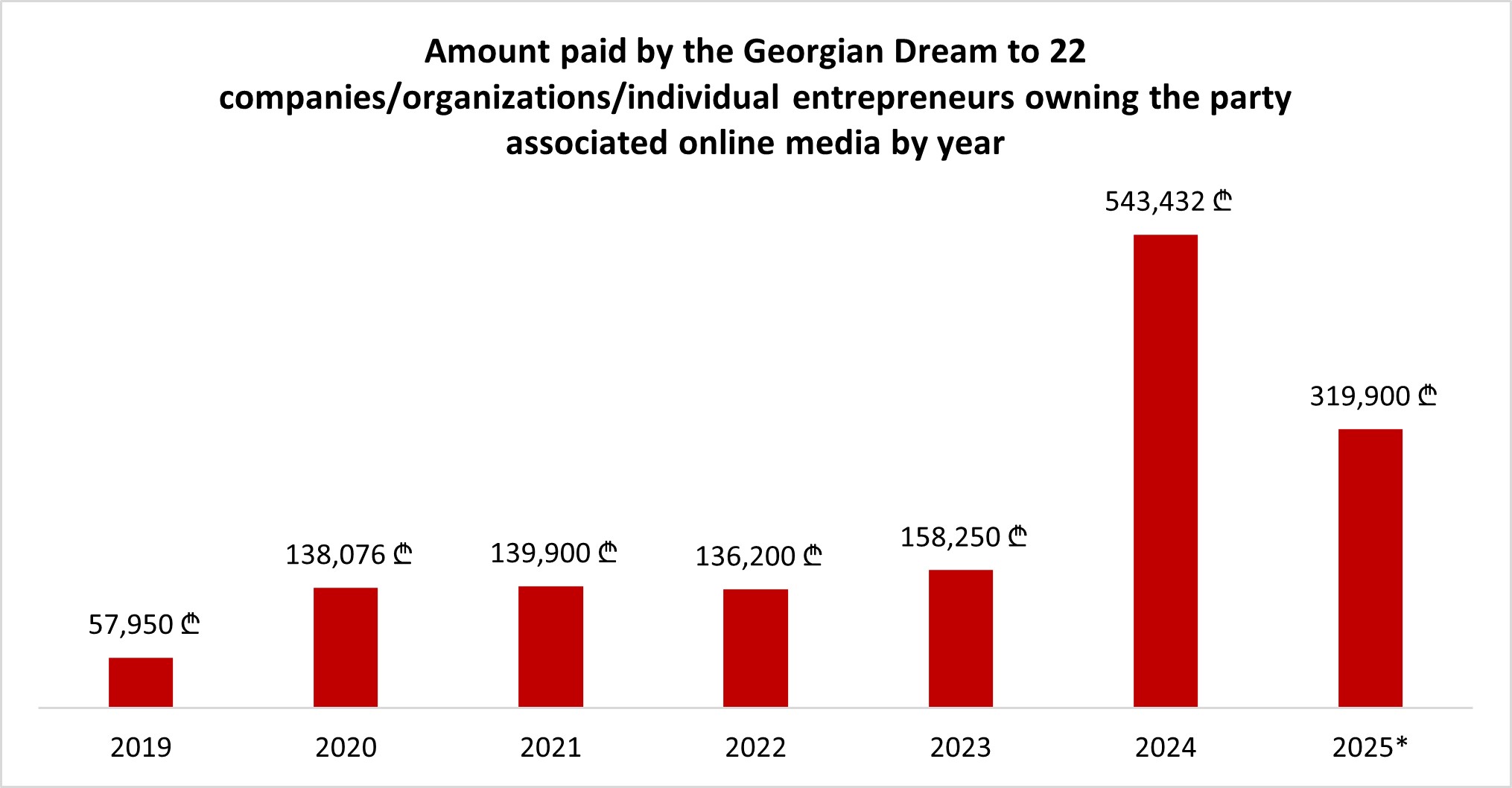 - According to financial declarations submitted to the Anti-Corruption Bureau and the State Audit Office, between 2019 and 2025, Georgian Dream paid a total of 1,503,708 GEL to 22 online media companies or organizations. Over the past two years, payments have been made almost on a monthly basis, both during and outside election periods, indicating a stable and long-term cooperation between the party and these outlets.