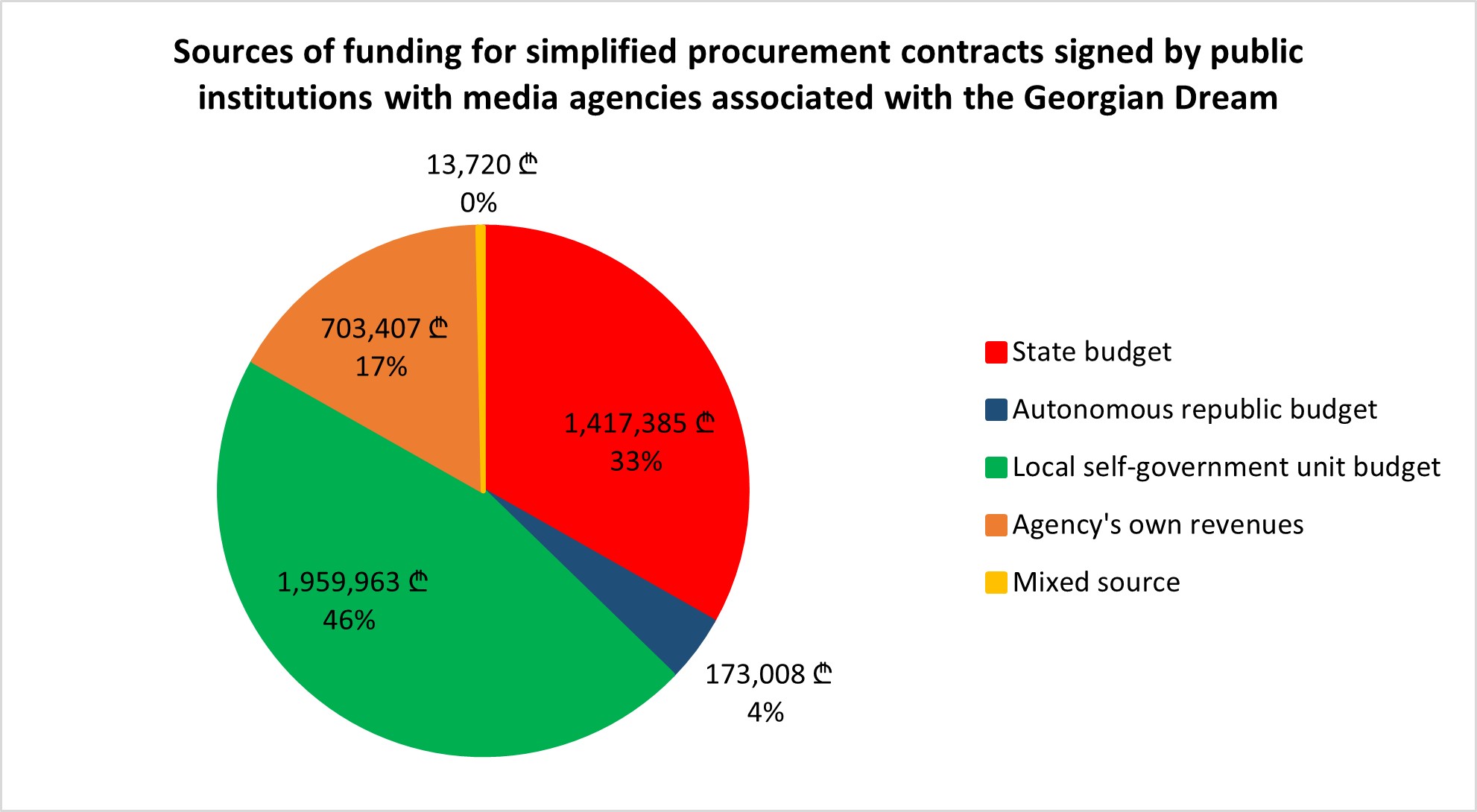 As of 15 October 2025, between 2012 and 2025, the primary sources of simplified procurement funding for online media companies associated with Georgian Dream were local self-government budgets (46%) and the state budget (33%). Four percent of funding originated from the governments of the Autonomous Republics of Adjara and Abkhazia, while 17% came from the own revenues of public institutions. Less than 1% of the total was covered by mixed sources.