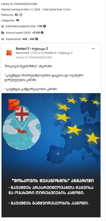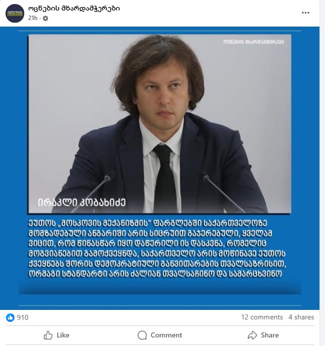 მოსკოვის მექანიზმის ფარგლებში მომზადებული დასკვნების დაკნინებისა და მისი რეკომენდაციების საზოგადოებისთვის მანიპულაციურად მიწოდების მიზნით, „ქართული ოცნების“ პორპაგანდისტულმა ეკოსისტემამ, რომელზეც „სამართლიან არჩევნებს” არაერთხელ დაუწერია, კოორდინირებული საინფორმაციო კამპანია წამოიწყო. კამპანიის ძირითადი გზავნილის მიხედვით, ეუთო „ოჯახური ღირებულებების შესახებ კანონისა“ და „უცხოური გავლენის გამჭვირვალობის შესახებ კანონის“ გაუქმებას ითხოვს. გავრცელებულ ქარდებზე მხოლოდ ეს მოთხოვნები იყო გამოტანილი და რჩებოდა შთაბეჭდილება, რომ დასკვნა მხოლოდ ამ საკითხებს შეეხებოდა. აღნიშნული ქარდები, იდენტური ტექსტებით, ანგარიშის გამოქვეყნებიდან რამდენიმე წუთში ყველა პროპაგანდისტული მედიის გვერდზე განთავსდა. იმ გვერდებზე კი, რომლებსაც დარეკლამების ფუნქცია შეზღუდული არ აქვთ, პოსტები დასპონსორებული იყო.