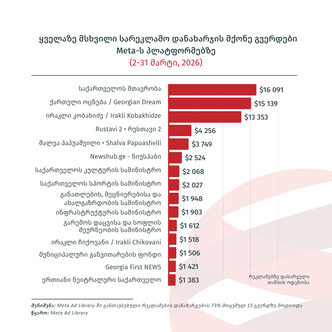 სარეკლამო დანახარჯებით ლიდერმა 15-მა გვერდმა მონიტორინგის პერიოდში მთლიანი ხარჯების 73% გასწია. მათ შორის ყველაზე მეტი თანხა საქართველოს მთავრობის, „ქართული ოცნებისა“ და ირაკლი კობახიძის ოფიციალური გვერდების რეკლამებისთვის დაიხარჯა (თითოეულ გვერდზე - დაახლ. 13-16 ათასი აშშ დოლარი). აღსანიშნავია, რომ, წინა პერიოდისგან განსხვავებით, გასულ თვეში სარეკლამო დანახარჯებით ლიდერ გვერდებს შორის აღარ იყო წარმოდგენილი „იმედისა“ და „პოს ტვ“-ის გვერდები, რომლებსაც Meta-ს პლატფორმებზე რეკლამების განთავსება დიდი ბრიტანეთის მიერ ტელეკომპანიების დასანქცირების გამო შეეზღუდათ.