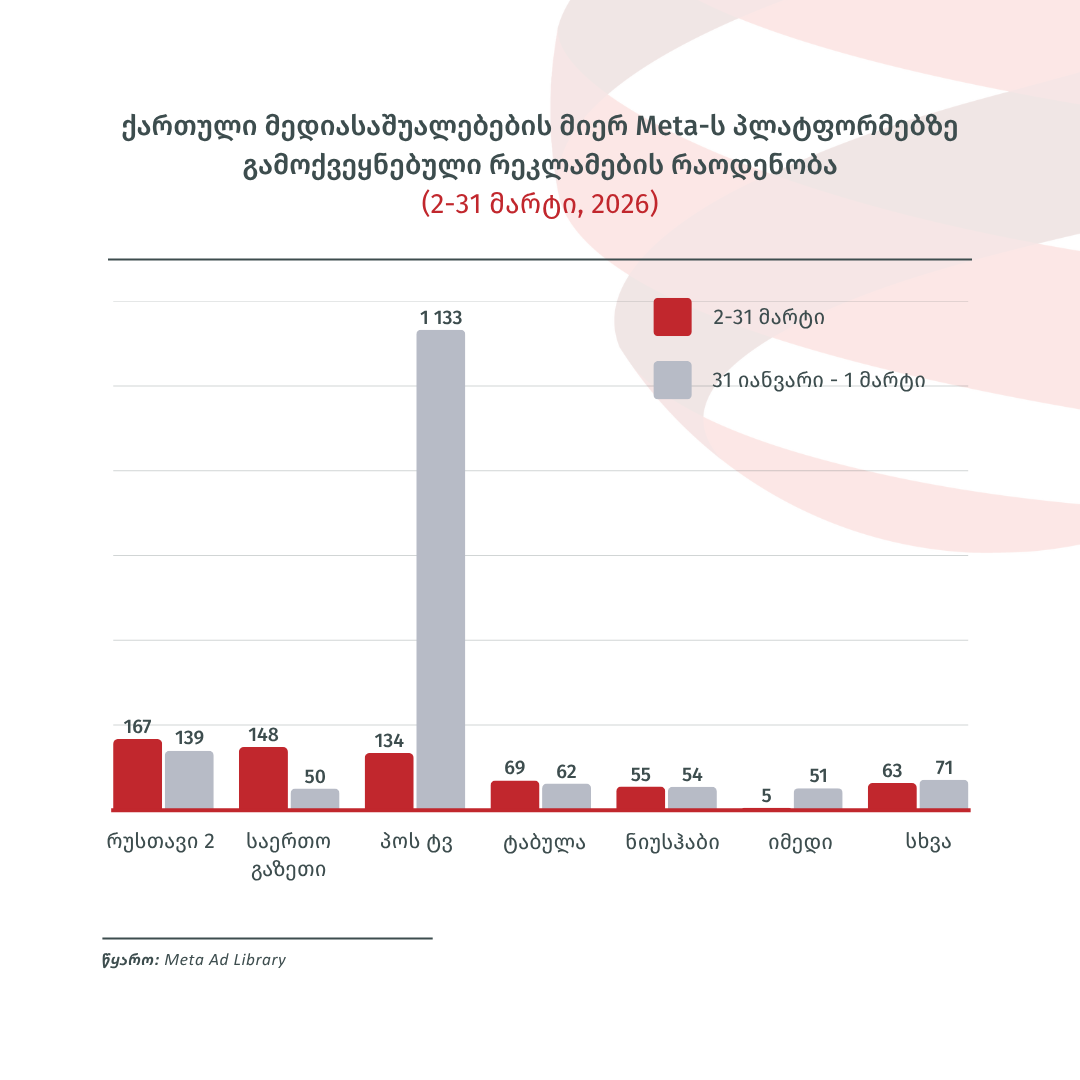 „ქართულ ოცნებასთან“ დაკავშირებული მედიასაშუალებების მიერ Meta-ს პლატფორმებზე განთავსებული პოლიტიკური რეკლამების რიცხვმა (641) მიმდინარე წლის მესამე 30 დღის განმავლობაში ყველა მედიასაშუალების მიერ გამოქვეყნებული რეკლამების რაოდენობის 83% შეადგინა, ხოლო მათზე დახარჯული თანხის ოდენობა (არანაკლებ $10,274 აშშ დოლარი) ქართული მედიასაშუალებების სარეკლამო დანახარჯების დაახლოებით 86%-ს გაუტოლდა. ამასთან, აღსანიშნავია, რომ დიდი ბრიტანეთის მიერ სანქცირებული „იმედისა“ და „პოს ტვ“-ის გვერდებზე 2 მარტიდან 31 მარტის ჩათვლით პერიოდში 8-ჯერ ნაკლები რაოდენობის რეკლამა განთავსდა, ვიდრე წინა 30 დღის განმავლობაში, ხოლო გამოქვეყნებული რეკლამების ჯამური ღირებულება 28-ჯერ ჩამორჩებოდა 31 იანვრიდან 1 მარტის ჩათვლით დახარჯული თანხის ოდენობას. მოცემულმა მედიასაშუალებებმა სანქციებით გამოწვეულ შეზღუდვებზე გვერდის ავლა ახალი ფეისბუქგვერდების შექმნით სცადეს, თუმცა მონიტორინგის პერიოდის ბოლოსათვის არცერთი ახალი გვერდი, რომლებზეც რეკლამები განთავსდა, მათ შორის - „POSTV - ამბები“, „POSTV – Insight“ და „იმედის მხარდამჭერები“, აღარ იძებნებოდა.