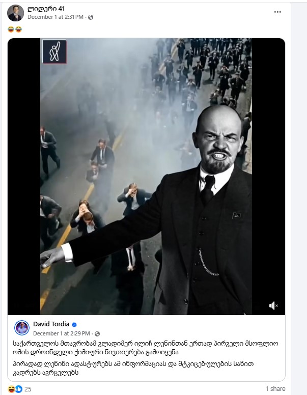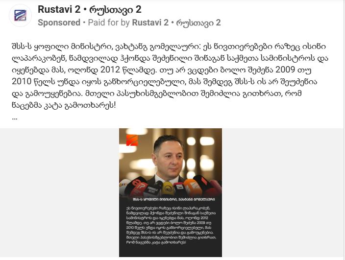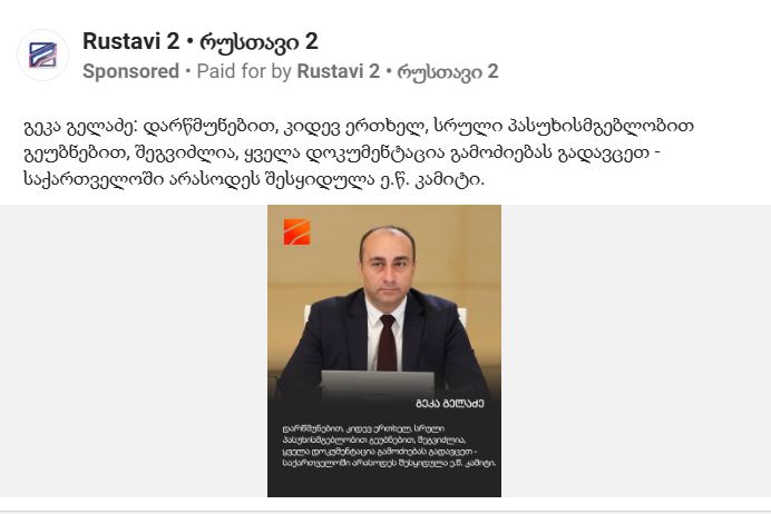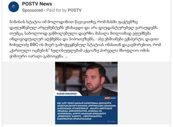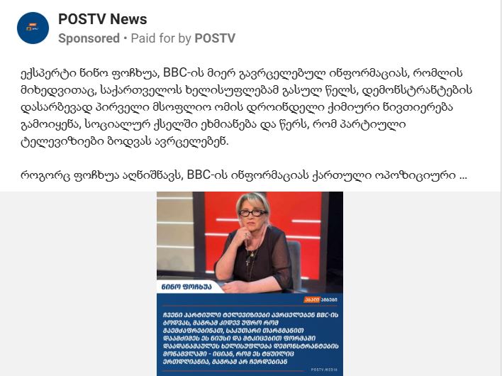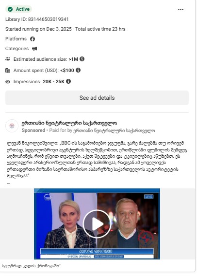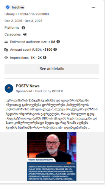 1-3 დეკემბრის პერიოდში „სამართლიანმა არჩევნებმა“ Meta-ის რეკლამების ბიბლიოთეკაში სულ მცირე 50 რეკლამა აღმოაჩინა, რომლებიც მიზნად პროპაგანდისტული გზავნილების უფრო მეტად გავრცელებას ისახავდა მიზნად. რეკლამების უმრავლესობა - 26, ერთ გვერდზე POSTV News-ზე გამოქვეყნდა და მათი უმრავლესობის ღირებულება 100$-ზე ნაკლები იყო. გამონაკლისს წარმოადგენდა „ქართული ოცნების“ ოფიციალურ ფეისბუქგვერდზე განთავსებული განცხადების პოსტი, რომლის რეკლამირებაშიც 900-დან 1000 აშშ დოლარამდე იქნა გადახდილი.