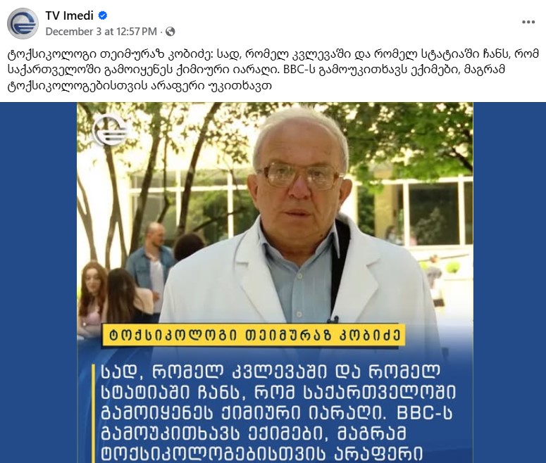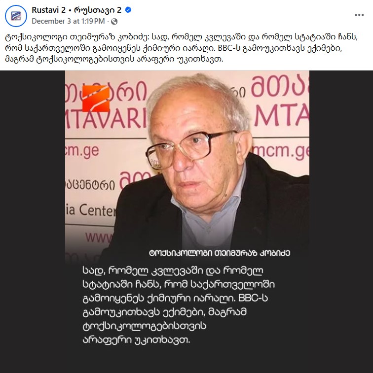 3 დეკემბერს პროპაგანდისტულმა მედიასაშუალებებმა - „იმედმა“, „პოს ტვ“-მ, „რუსთავი 2“-მა და სხვა სააგენტოებმა, მათ შორის საზოგადოებრივი მაუწყებლის პირველმა არხმა, გაავრცელეს კიდევ ერთი დეზინფორმაციული ნარატივი, რომლის მიხედვითაც, თითქოს BBC-ს გამოძიების ფარგლებში ტოქსიკოლოგისთვის არ მიუმართავს. ამ დეზინფორმაციული ნარატივის გასამყარებლად გამოყენებული იქნა ექიმ ტოქსიკოლოგ თეიმურაზ კობიძის კომენტარი.
