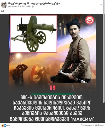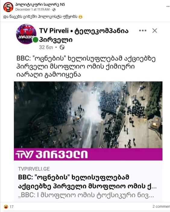 საქართველოში აქციების დასაშლელად აკრძალული ქიმიური ნივთიერების სავარაუდო გამოყენებაზე BBC-ის მიერ გამოქვეყნებულმა საგამოძიებო მასალამ ქვეყანაში მწვავე პოლიტიკური რეაქცია გამოიწვია. ამ კონტექსტში BBC-ის მასალას პარტია „ქართული ოცნების“ მხრიდან არა მხოლოდ უარყოფითი, არამედ მკვეთრად აგრესიული და ორგანიზებული საპასუხო კამპანია მოჰყვა, რომელშიც ჩართული იყვნენ პროპაგანდისტული მედია, პარტიასთან დაკავშირებული ექსპერტები, ანონიმური გვერდები და ანგარიშები.