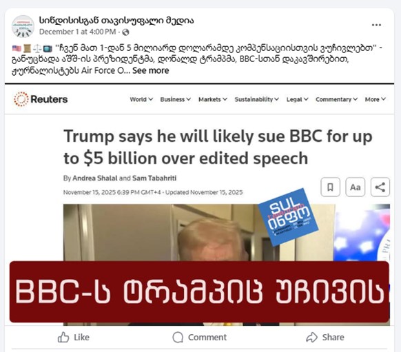 BBC-ის დისკრედიტაციის კამპანიაში „ექსპერტების“ შემდეგ პროპაგანდისტული მედია ჩაერთო. მათ ფეისბუქგვერდებზე გამოაქვეყნეს იდენტური ქარდები, 10 ნოემბერს დონალდ ტრამპის მიერ გაკეთებული განცხადების შესახებ, რომელშიც ის მედიისთვის სასამართლოში ჩივილზე საუბრობდა. აღნიშნული გზავნილი მედიის შემდეგ აქტიურად გაავრცელეს „ექსპერტებმა” და „ქართული ოცნების“ წარმომადგენლებმა.