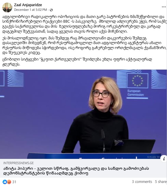 1 დეკემბერს პროპაგანდისტულმა მედიამ გამოაქვეყნა „ქართული ოცნების“ ლიდერების განცხადებები, რომლებშიც BBC-ის სტატია შეფასებული იყო მიზანმიმართული საერთაშორისო კამპანიის ნაწილად. ოფიციალურ კომენტარებში ჟურნალისტური გამოძიება წარმოდგენილი იქნა, როგორც საქართველოს წინააღმდეგ შესაძლო ორკესტრირებული შეტევა, ხოლო თავად BBC - როგორც მიკერძოებული, პოლიტიკური გავლენების მატარებელი და არასანდო მედია.
