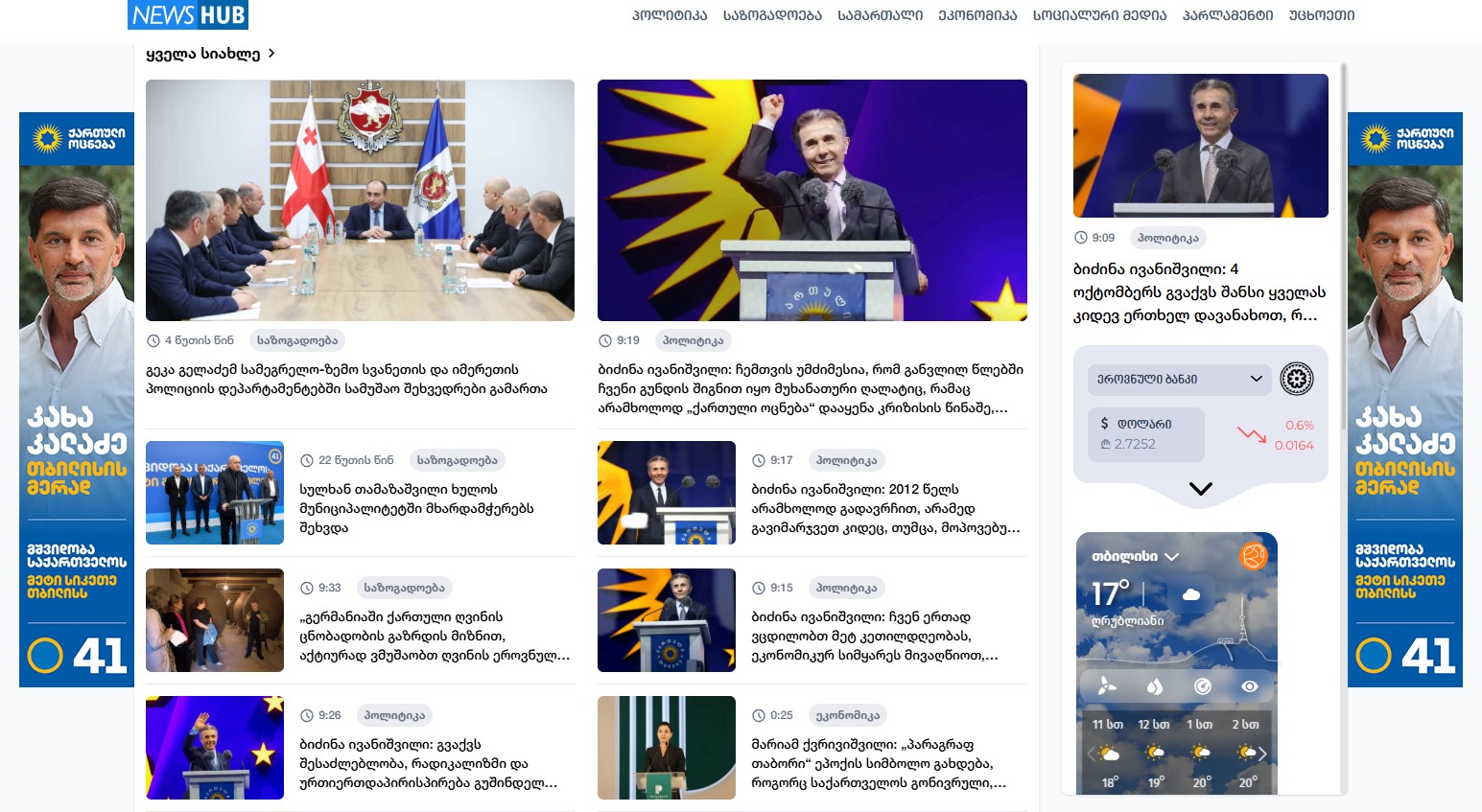 ზოგიერთი ონლაინ მედიის სააგენტო, პროსახელისუფლებო ტელეკომპანიების - „იმედისა“ და „პოს ტვ“-ის მსგავსად, აქტიურად აწარმოებს „ქართული ოცნების“ სასარგებლოდ სოციალურ მედიაში სარეკლამო კამპანიასაც. მათ შორის, 2020 წლის 4 აგვისტოდან 2025 წლის 20 სექტემბრამდე პერიოდში ნიუსჰაბის ფეისბუქგვერდზე - „Newshub.ge - ნიუსჰაბი“ (2020 წლის 25 ნოემბრამდე - „Pia.ge - ახალი ამბები“) 1,721 პოლიტიკური რეკლამა გამოქვეყნდა, რომელთა ჯამურმა ღირებულებამ არანაკლებ 25,435 აშშ დოლარი შეადგინა. ამ რეკლამების ძირითადი ნაწილი „ქართული ოცნებისა“ და მისი წარმომადგენლების, აგრეთვე, პარტიასთან დაკავშირებული პირების განცხადებებს გამოხატავდა. ამასთან ერთად, ბოლო პერიოდში ფეისბუქგვერდზე ქვეყნდება ევროკავშირის მადისკრედიტირებელი რეკლამებიც, რაც თანხვედრაშია „ქართული ოცნებისა“ და მასთან დაკავშირებული პირების მიერ წარმოებულ ნარატივებთან.