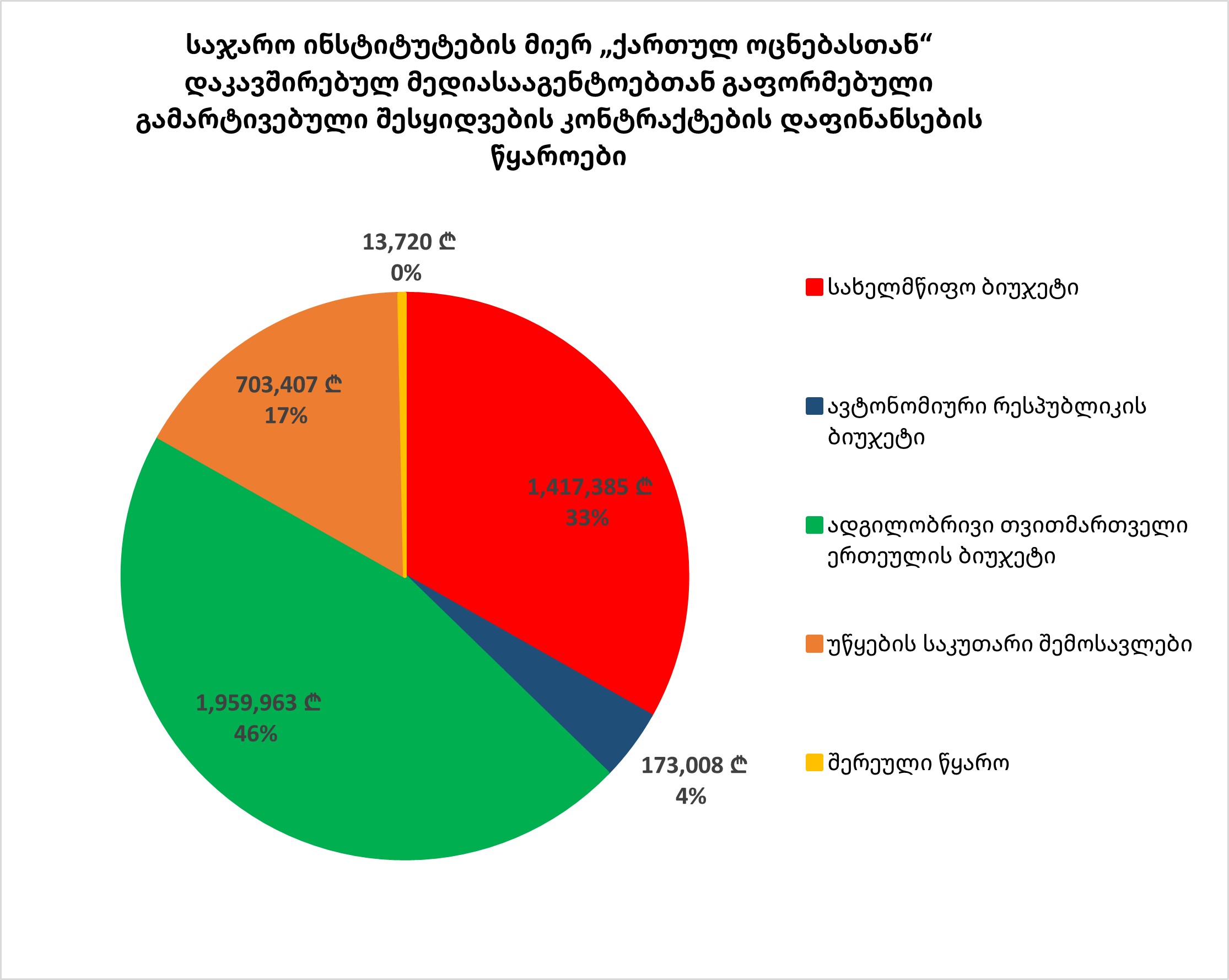 - „ქართულ ოცნებასთან“ დაკავშირებული ონლაინ მედიის კომპანიების მიერ საბიუჯეტო უწყებებთან გაფორმებული გამარტივებული შესყიდვების კონტრაქტების მიხედვით, დაფინანსების ძირითად წყაროს ადგილობრივი თვითმმართველი ერთეულებისა (46%) და სახელმწიფო ბიუჯეტები (33%) წარმოადგენდა. დაფინანსების 4% მიღებული იქნა აჭარისა და აფხაზეთის ავტონომიური რესპუბლიკების მთავრობებისგან, ხოლო 17% დაფინანსებული იქნა საჯარო უწყებების საკუთარი შემოსავლების მეშვეობით;