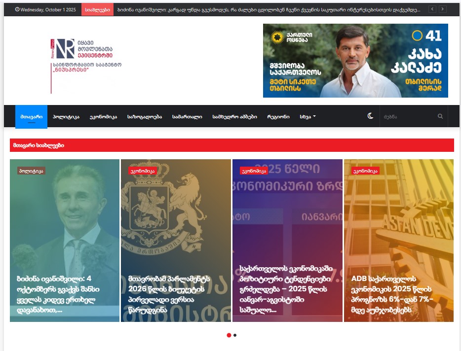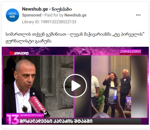 - დაფინანსებული მედიასაშუალებების სარედაქციო პოლიტიკა თანხვედრაშია მმართველი პარტიის ნარატივებთან. ისინი ტირაჟირებენ „ქართული ოცნების“ გზავნილებს, ამზადებენ ან ავრცელებენ პროპაგანდისტულ კონტენტს, ხოლო ზოგ შემთხვევაში ორგანიზებულად მონაწილეობენ ოპოზიციის წინააღმდეგ მიმართულ კამპანიებში. ძირითადად „ქართული ოცნებისთვის“ ხელსაყრელი ნარატივების გასავრცელებლად ნიუსჰაბის (2020 წლის 25 ნოემბრამდე - „Pia.ge - ახალი ამბები“) ფეისბუქგვერდზე 2020-2025 წლებში 25.4 ათას აშშ დოლარზე მეტი ღირებულების 1,721 პოლიტიკური რეკლამაც განთავსდა;