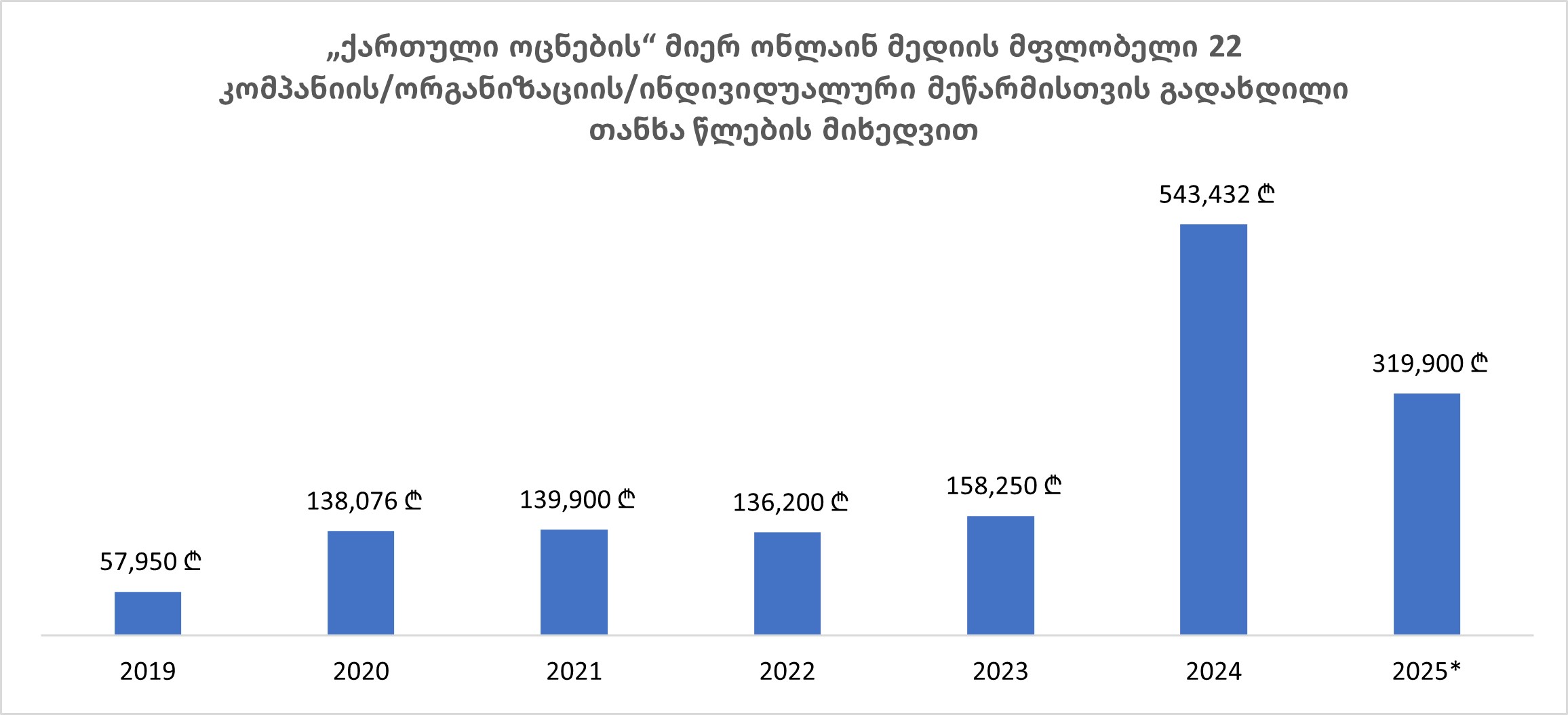 2019-2025 წლებში „ქართული ოცნება“ სისტემატურად აფინანსებდა მასთან დაკავშირებულ ონლაინ მედია სააგენტოებს, რამაც განსაკუთრებულ მასშტაბს გასული წლიდან მიაღწია. ანტიკორუფციულ ბიუროსა და სახელმწიფო აუდიტის სამსახურში წარდგენილი ფინანსური დეკლარაციების მიხედვით, 2019-2025 წლებში პარტიამ ონლაინ მედიის 22 კომპანიას/ორგანიზაციას/ინდმეწარმეს ჯამში 1,503,708 ლარი გადაუხადა. ბოლო ორი წლის განმავლობაში გადახდები ხორციელდებოდა თითქმის ყოველთვიურად, როგორც საარჩევნო, ისე არასაარჩევნო პერიოდში, რაც ცხადყოფს, რომ პარტიასა და ამ სააგენტოებს შორის გრძელვადიანი და სტაბილური თანამშრომლობა ჩამოყალიბდა. თანხები დეკლარირებული იყო, როგორც საინფორმაციო მომსახურების ან რეკლამისთვის განკუთვნილი ხარჯები.